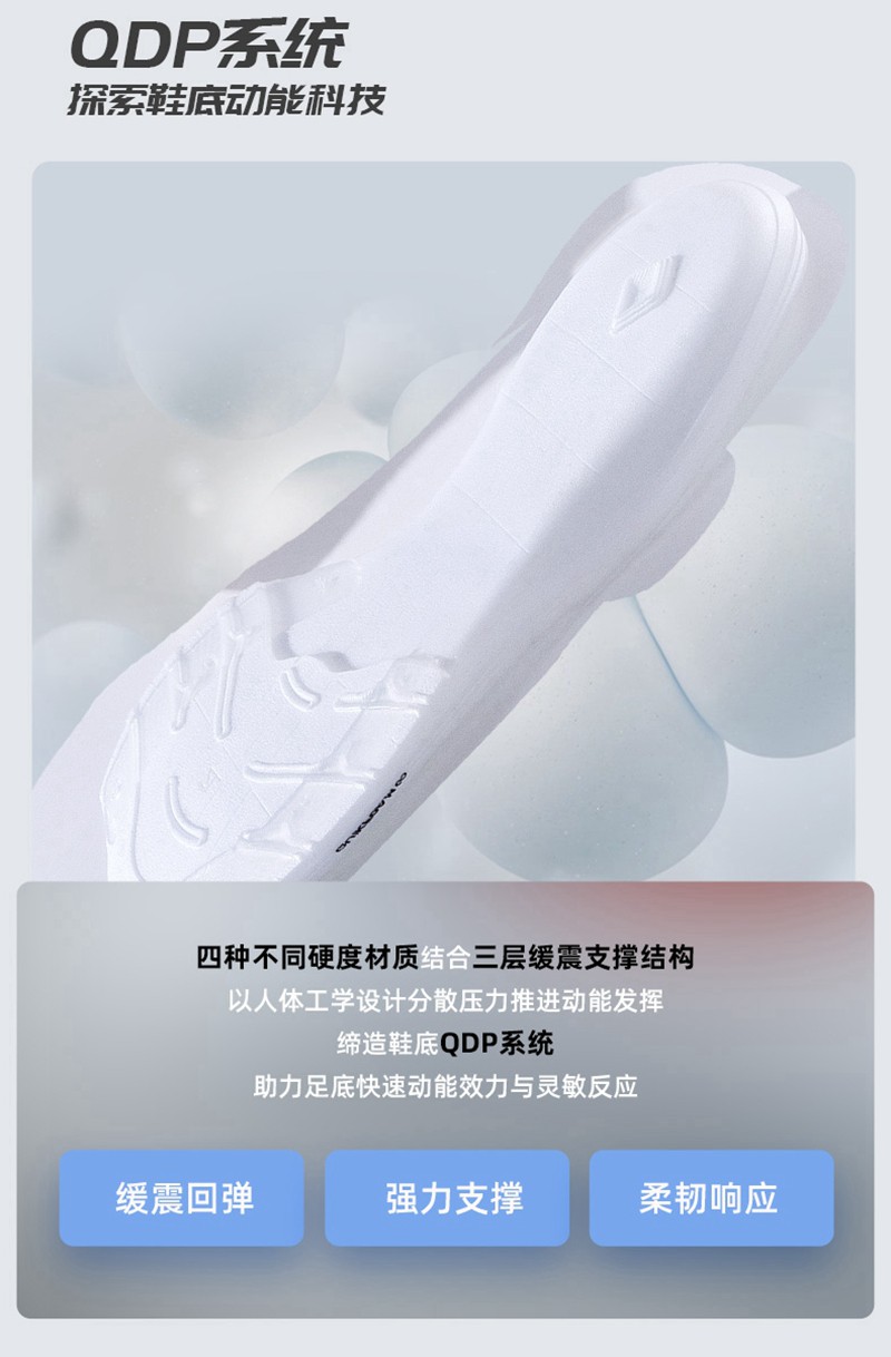 中底的 QDP 系统由四种不同硬度材质和三层缓震支撑结构组成,并结合人体工学设计,保证运动过程中的良好表现。