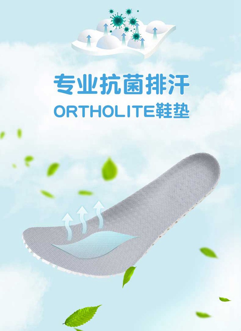 鞋款内部加持 ORTHOLITE 抗菌排汗鞋垫,保证脚部舒适。