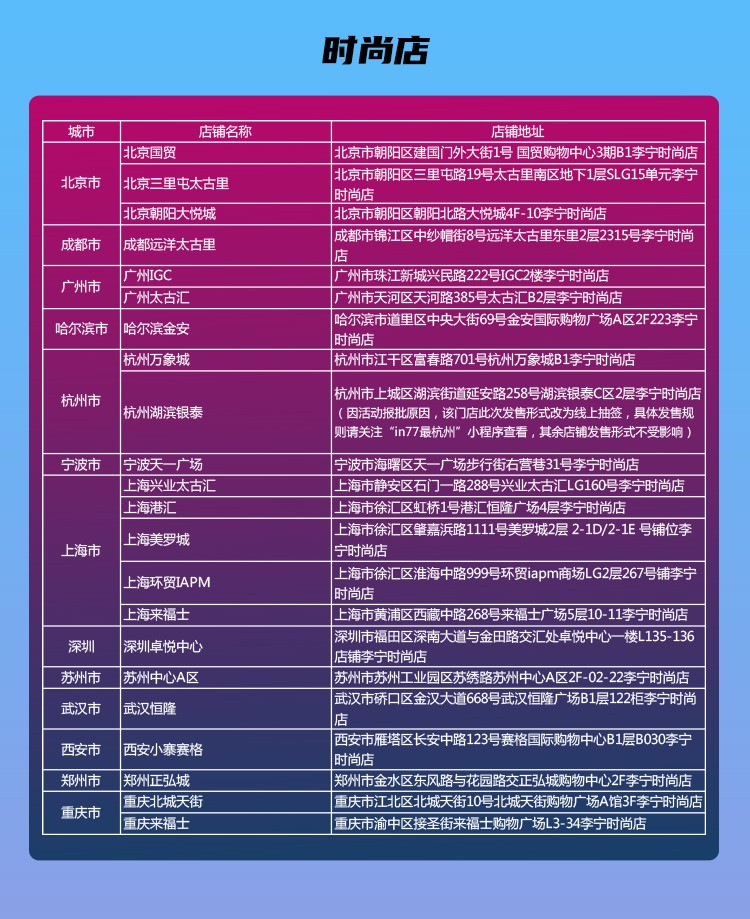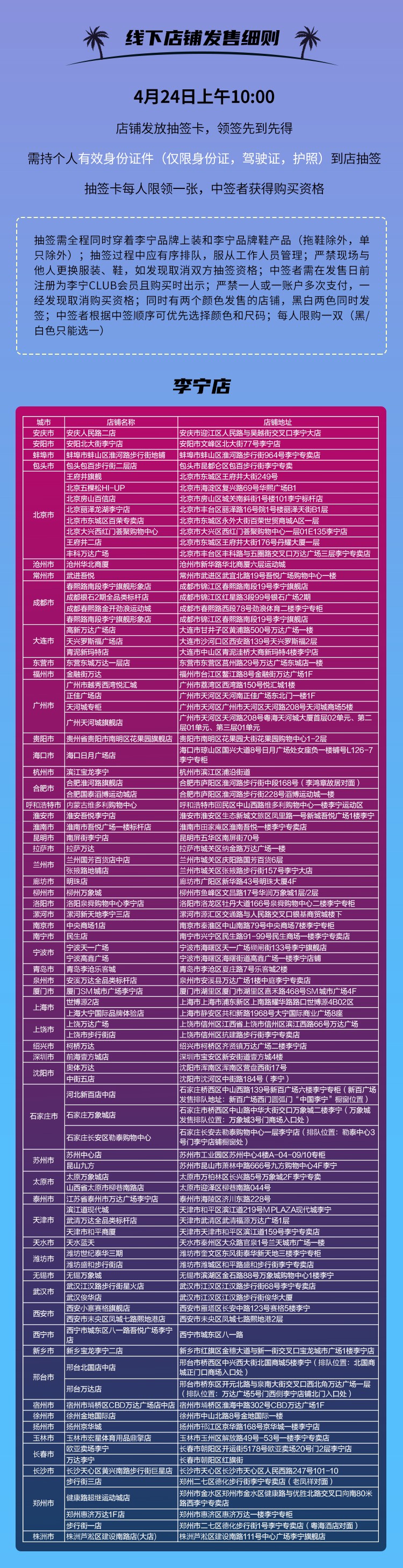 全国超多城市以及众多店铺都将参与发售,详细城市列表小编已在文末给出,详情还请各位仔细阅读李宁官方微信公众号!