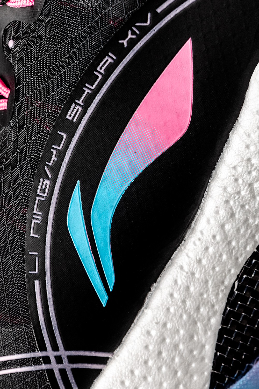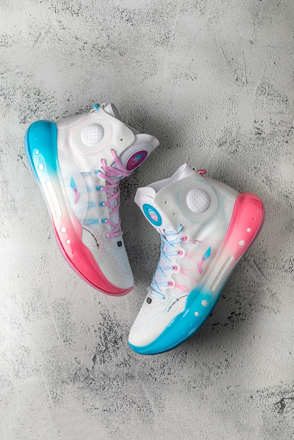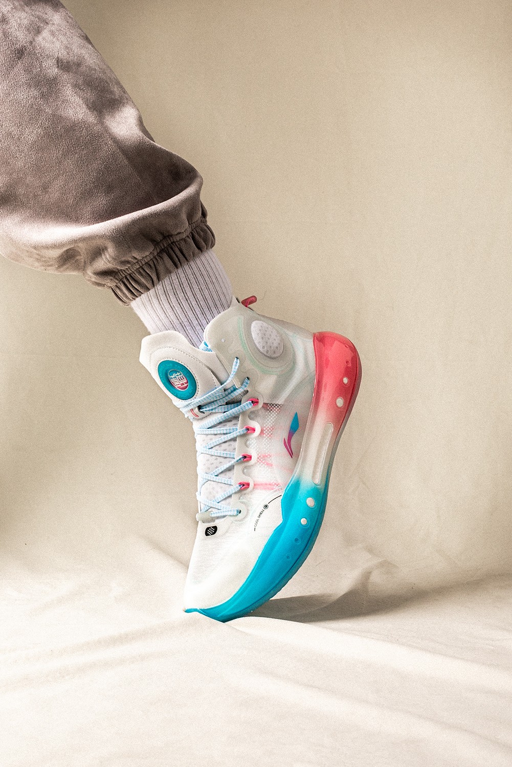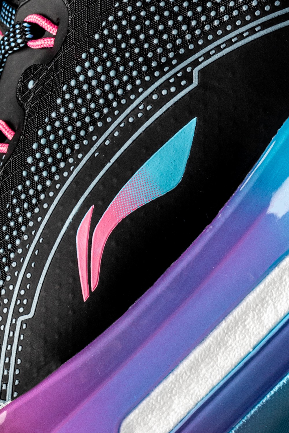 同时侧身李宁 Logo 在色调上也与中底一致,采用蓝粉渐变效果打造。