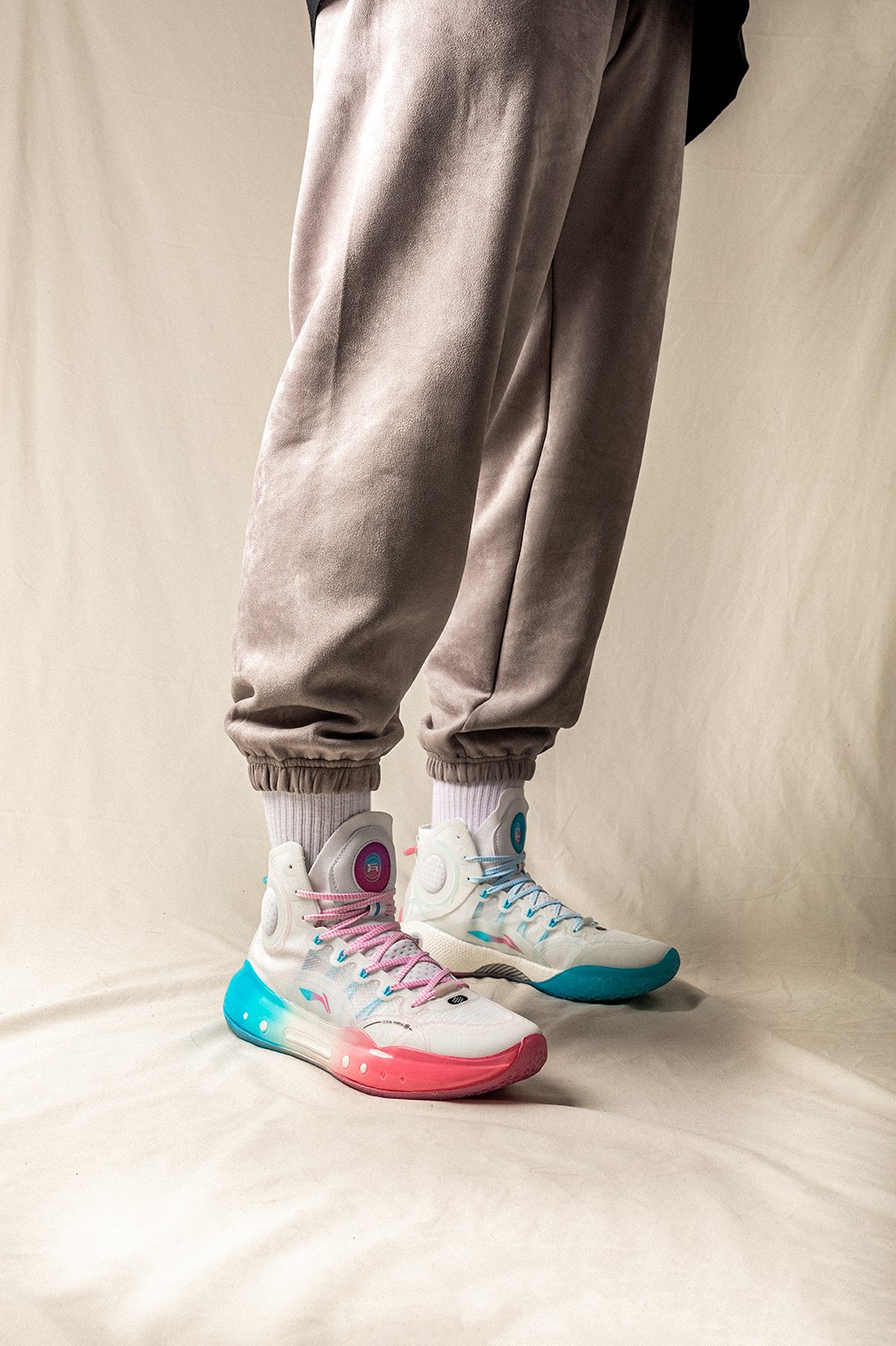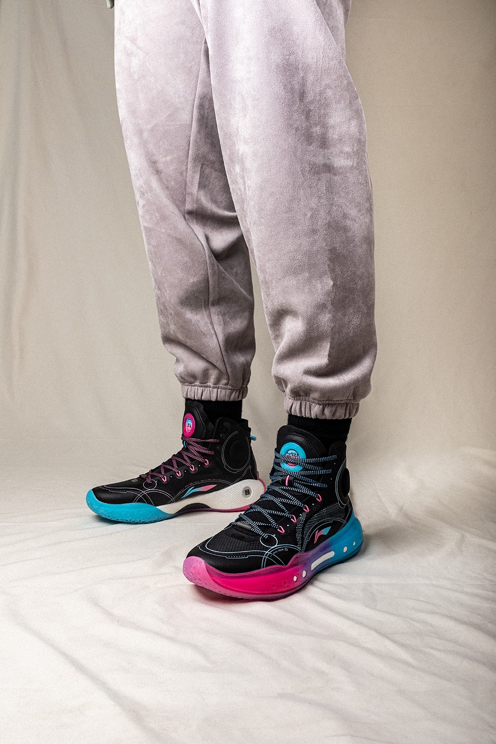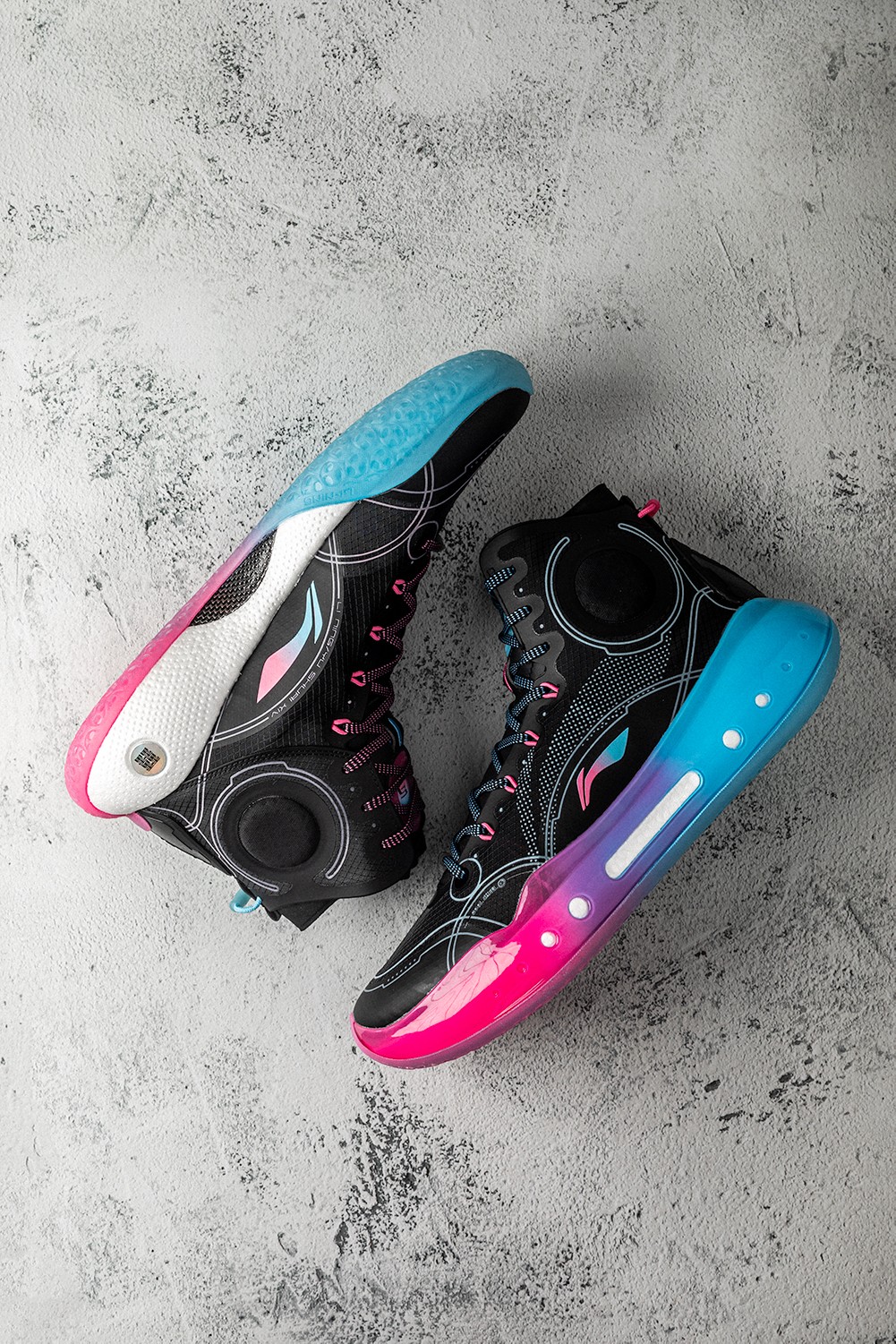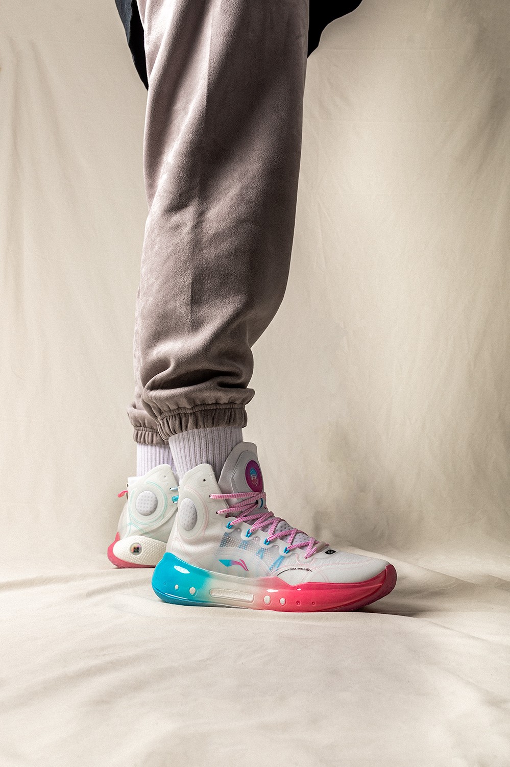 同时侧身李宁 Logo 在色调上也与中底一致,采用蓝粉渐变效果打造。