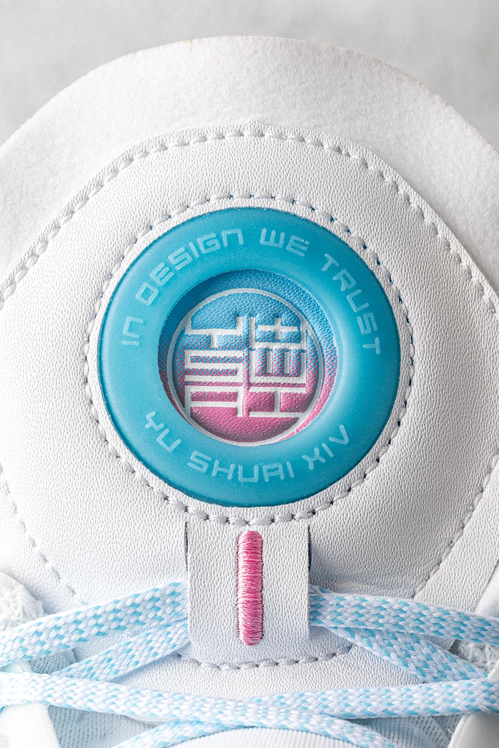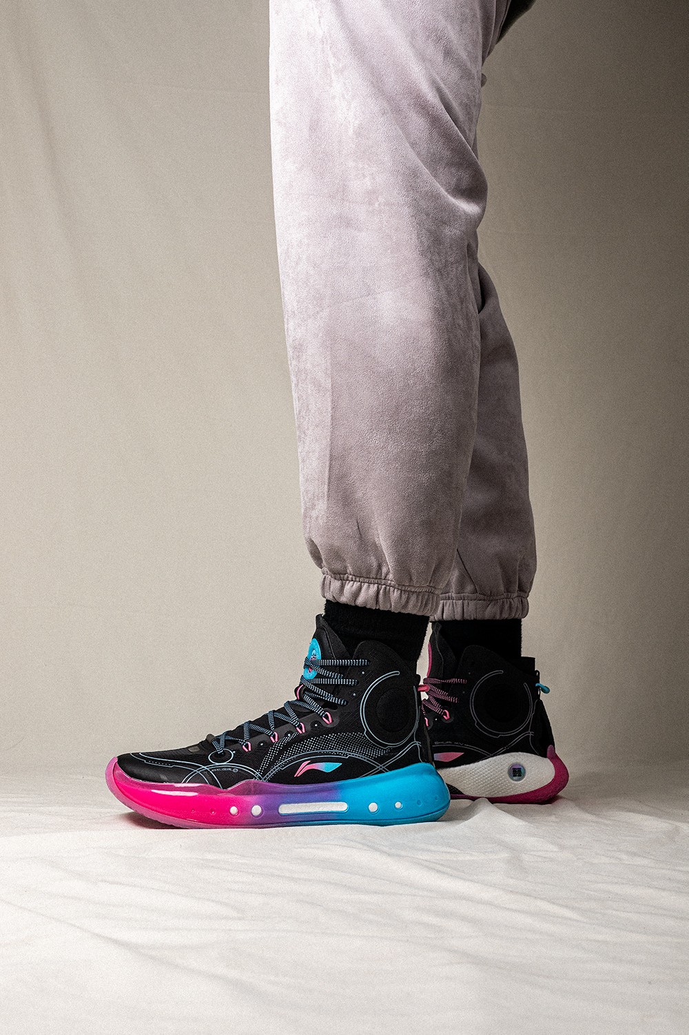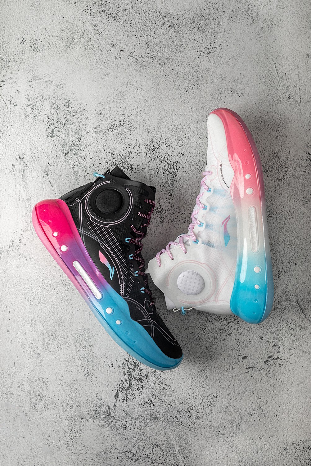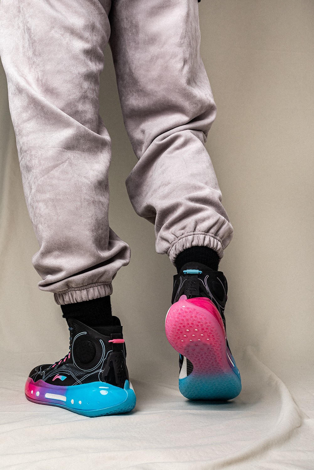 同时侧身李宁 Logo 在色调上也与中底一致,采用蓝粉渐变效果打造。