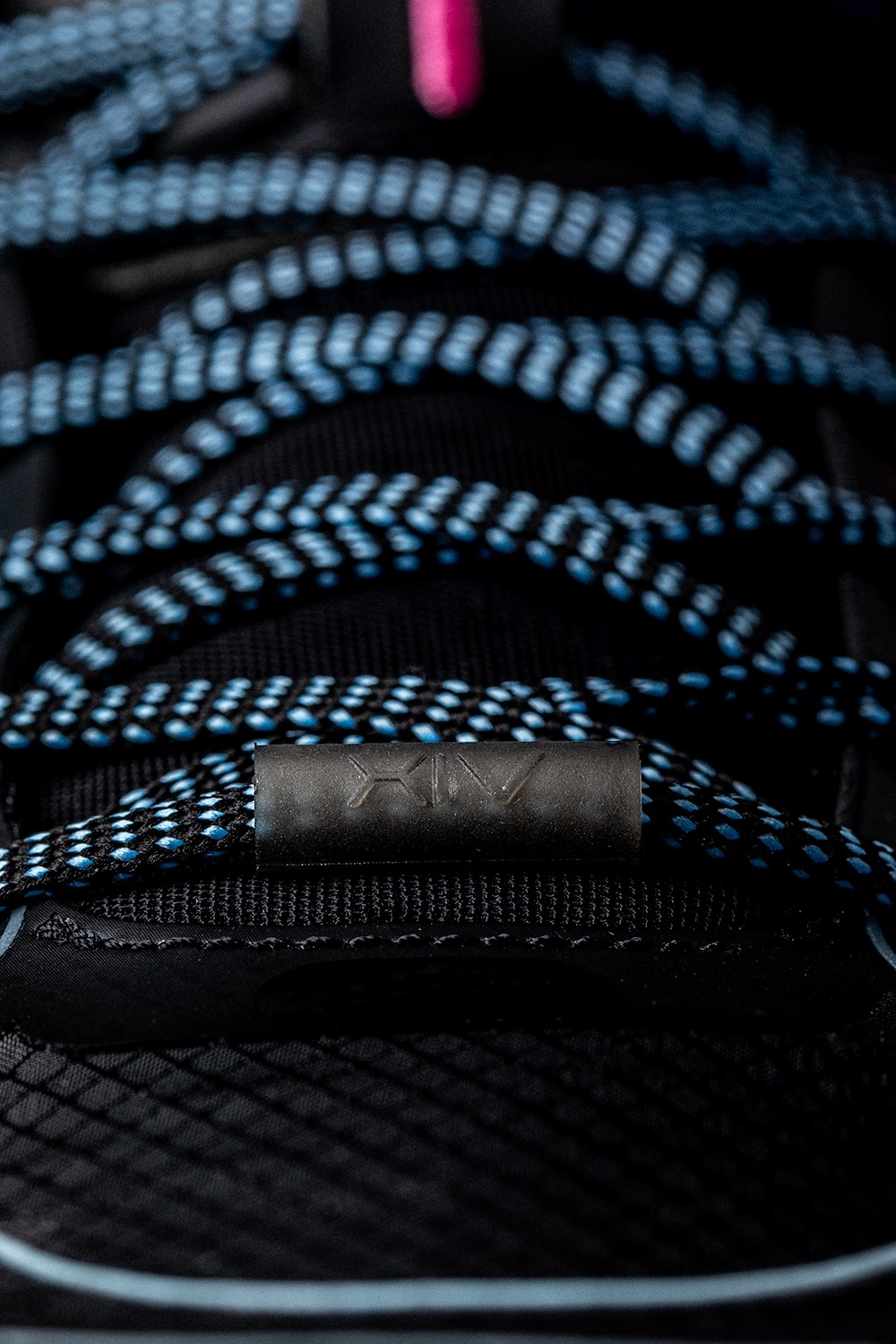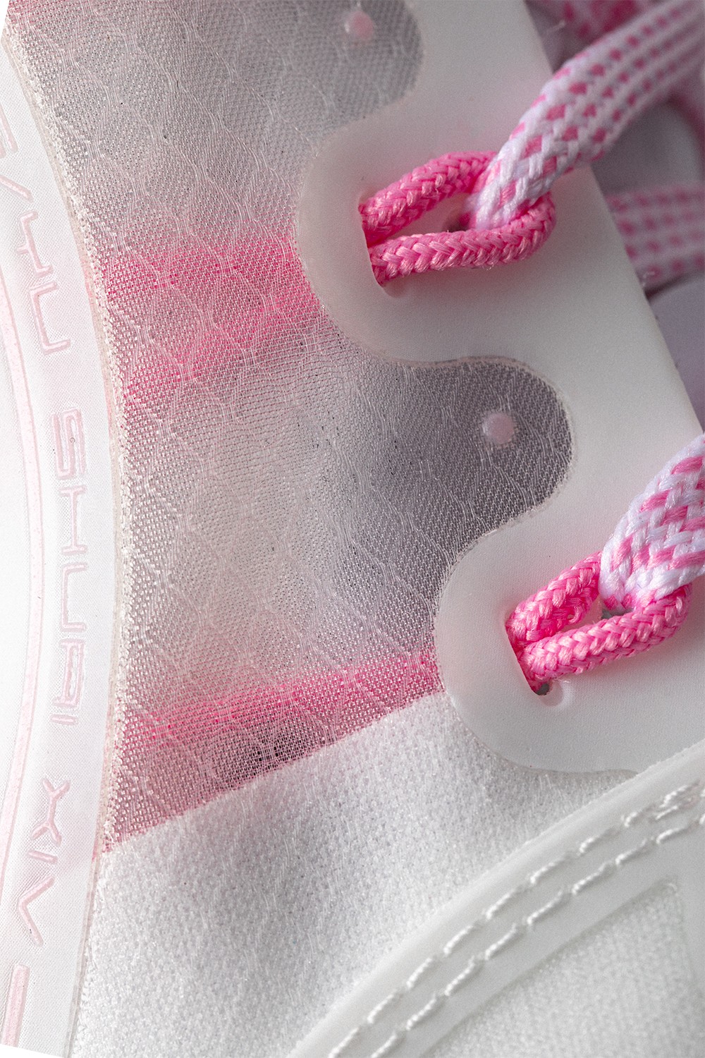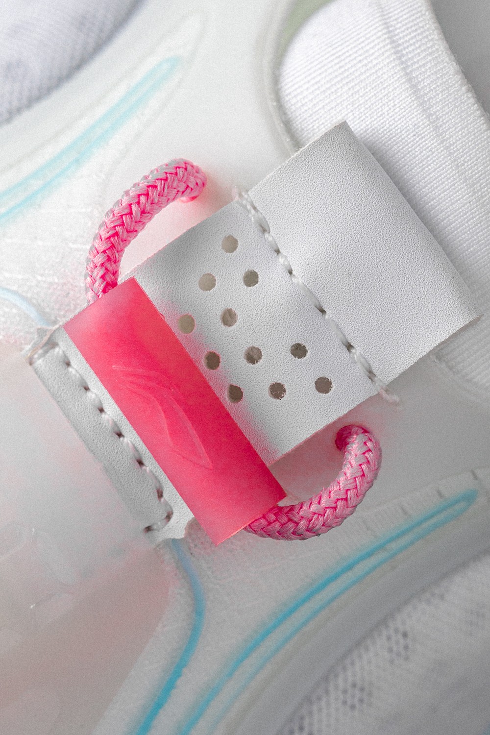 透过白色半透明鞋面看到,粉色以及蓝色的缆绳则显得清晰可见!