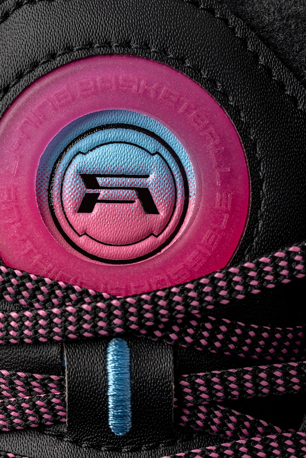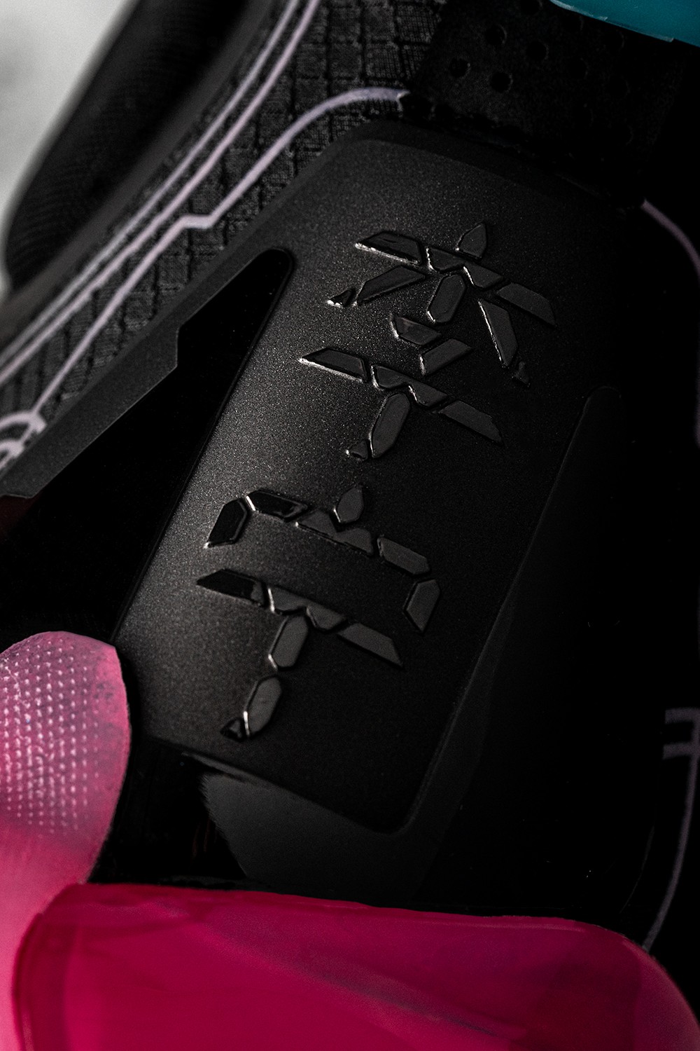 其中右脚在粉色橡胶圈的环绕内,点缀驭帅系列 Logo。