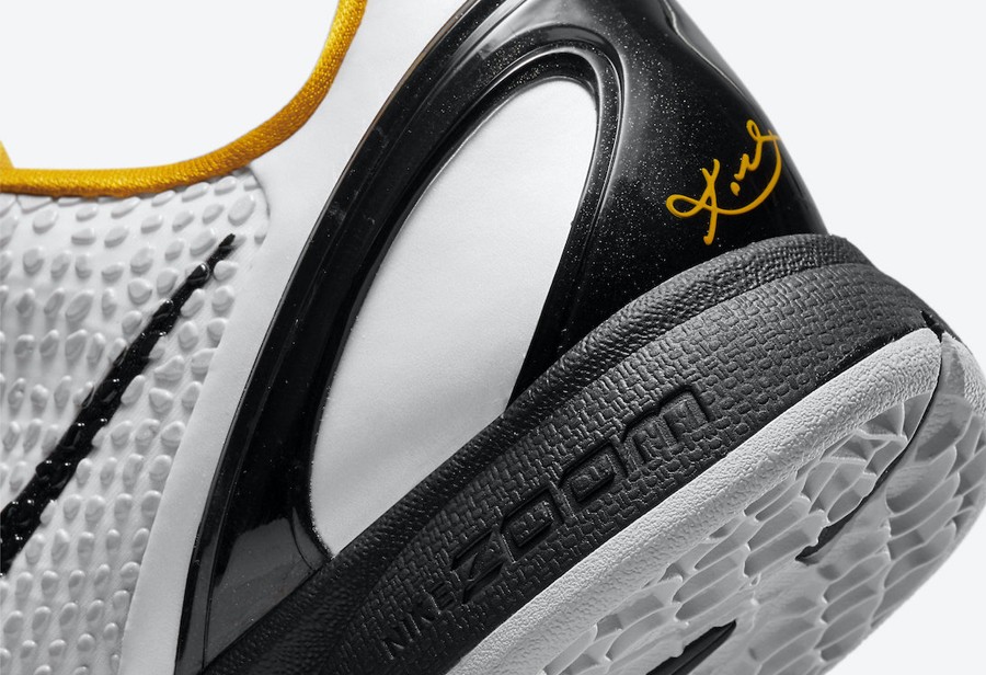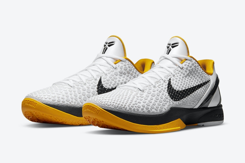 其中一双是元年配色 Nike Kobe 6 Protro “White Del Sol”,白灰色蛇鳞鞋面搭配黑、黄双色点缀,完美还原湖人球衣主题。