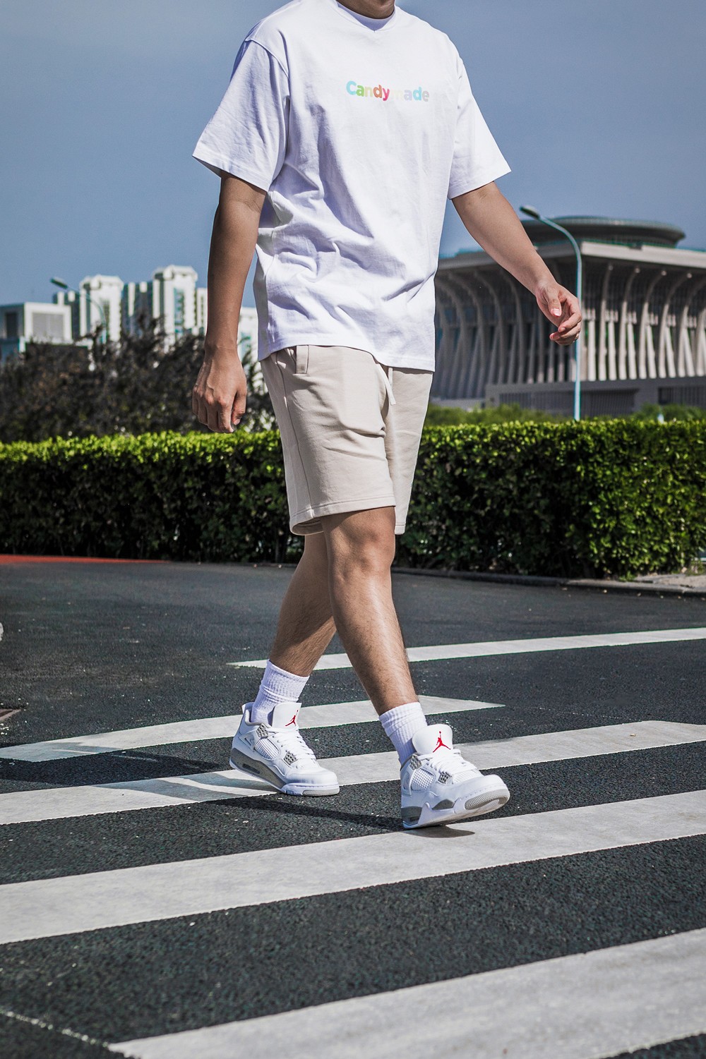 小编选择了传统的白色印花 T 恤和卡其色短裤,加上白色的球鞋,洋溢着满满的青春气息。