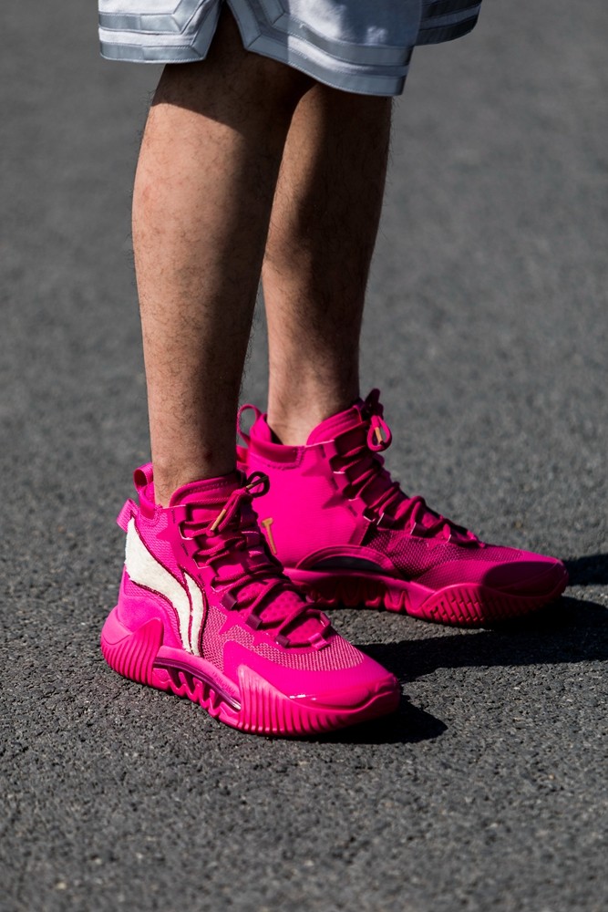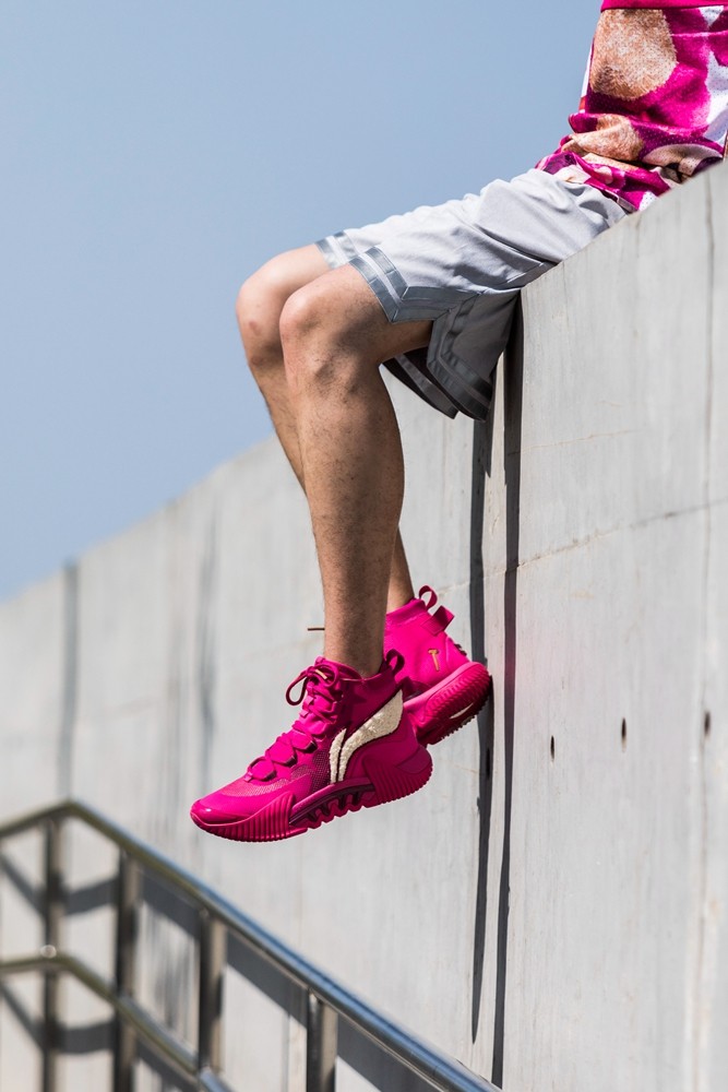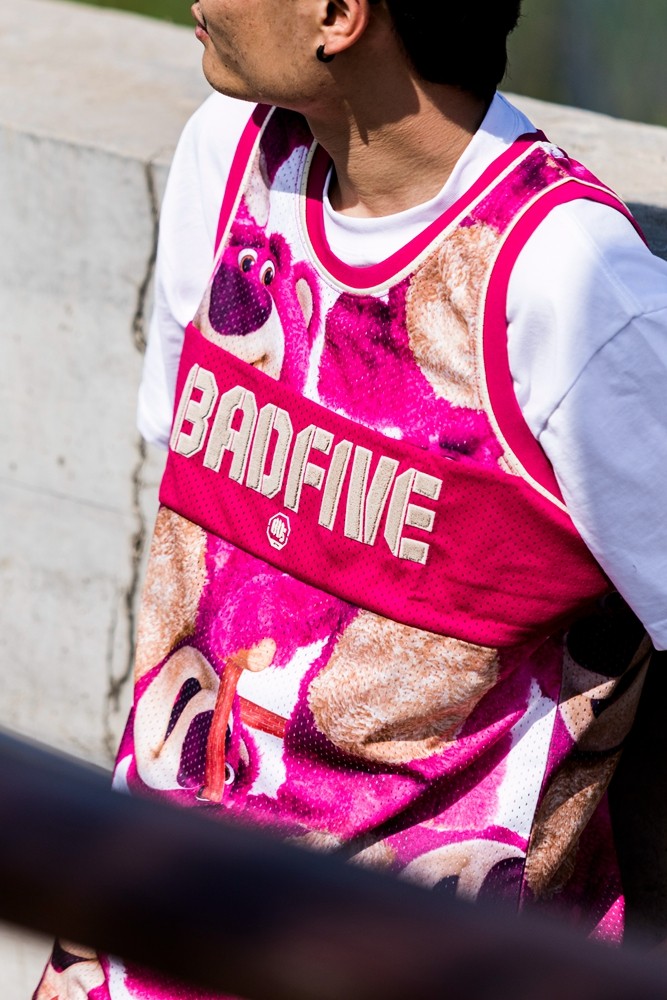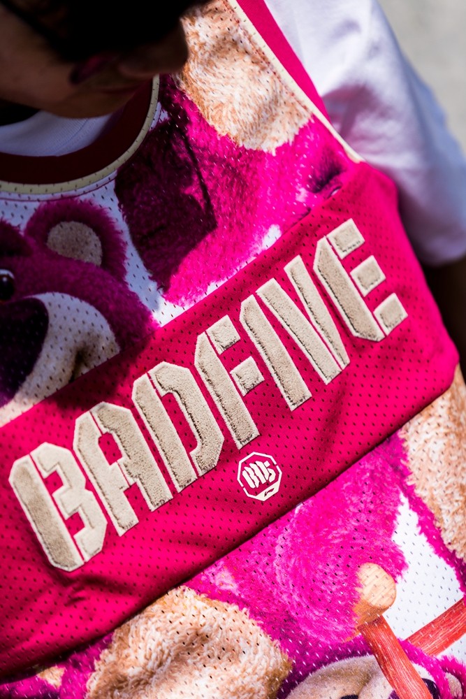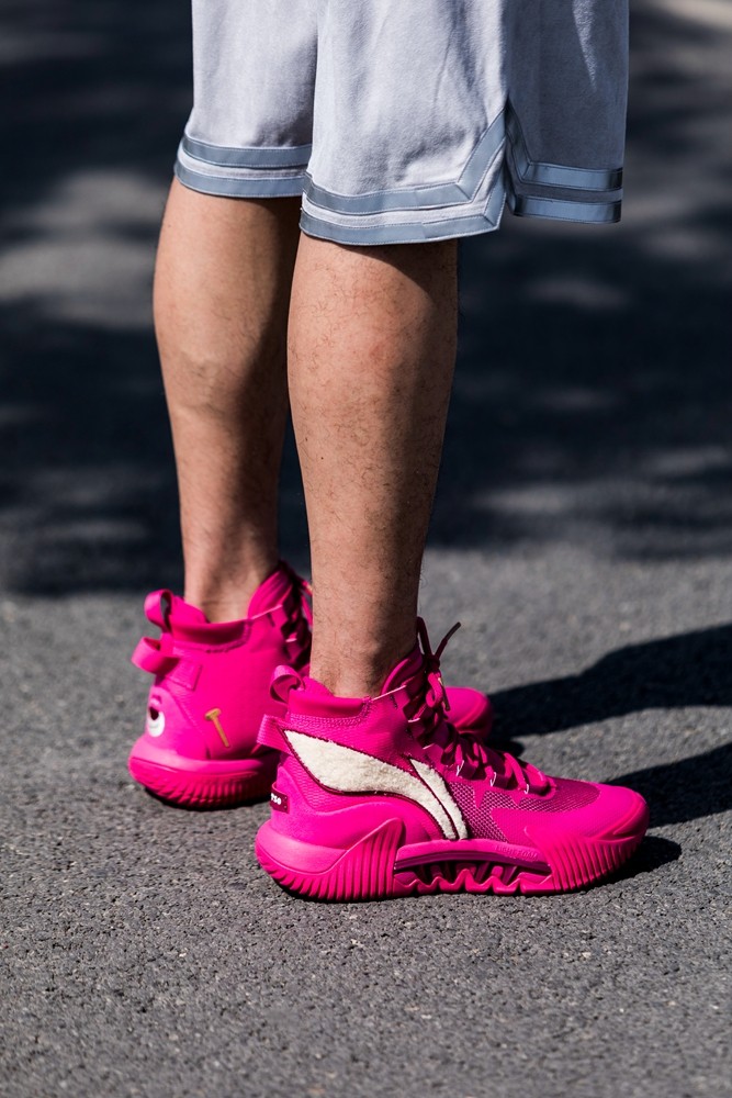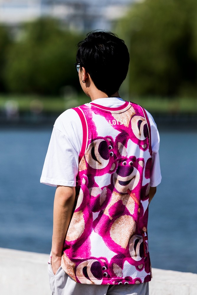 这次的草莓熊联名球鞋 + 球衣,穿上一整套真的需要点勇气,因为配色真的太骚了。