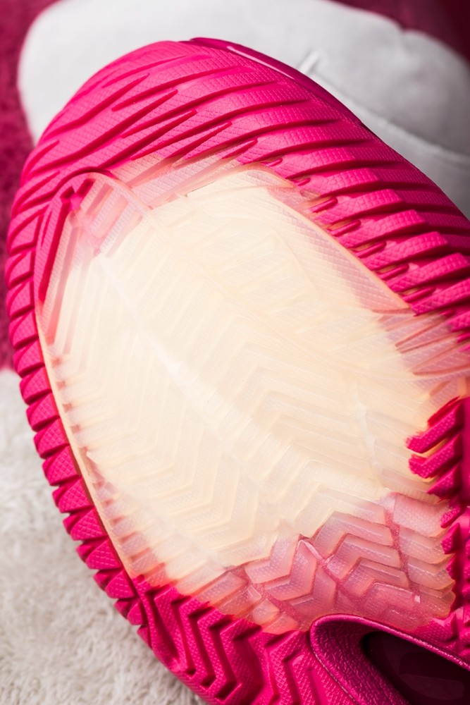 外底设计颇为特殊,前掌采用乳白色水晶橡胶,还原草莓熊熊掌造型,同时令前掌内置的䨻可视化。