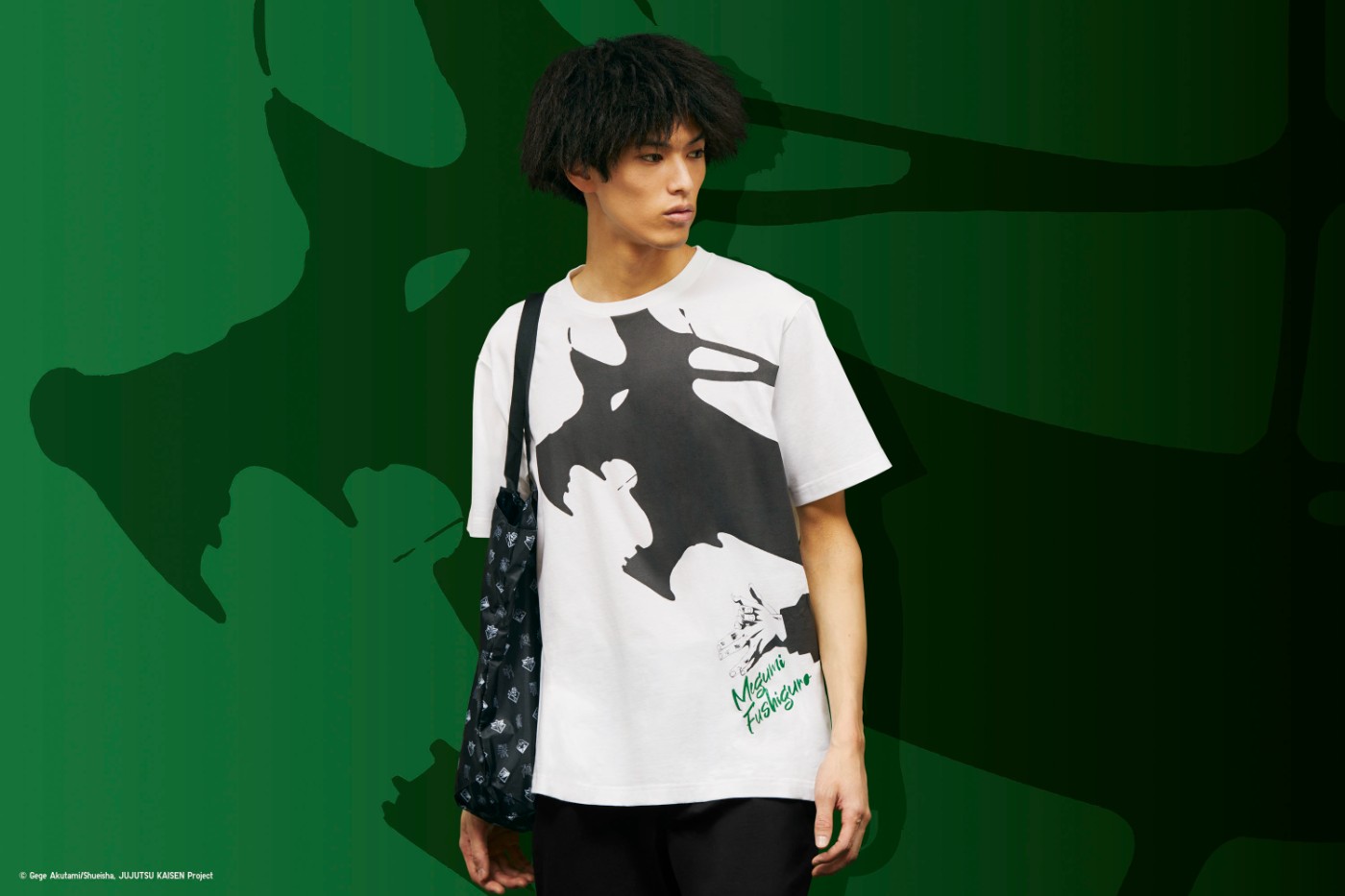 这次他的 UT 款式就采用式神「玉犬」形象,以召唤瞬间的超酷黑影呈现,下方还有伏黑惠的手型与之呼应。