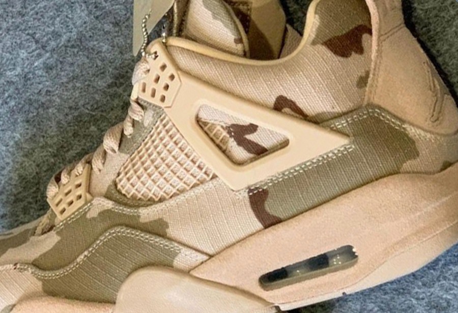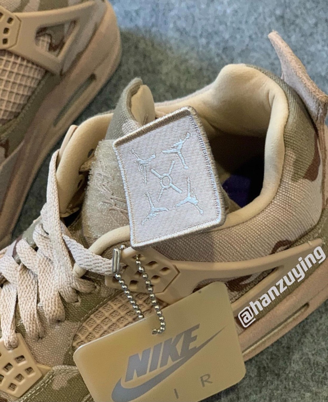 鞋面采用沙漠迷彩图案的防撕尼龙布打造,后跟、中底以沙色麂皮点缀。