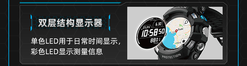 表身采用 G-SHOCK 独特的抗冲击构造,200 米专业级防水性能,还配备防水麦克风和充电口。