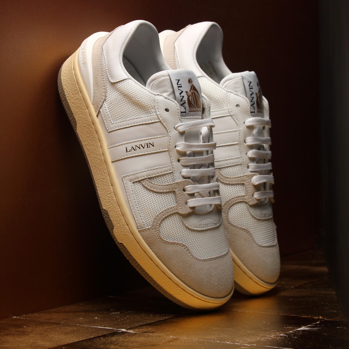 麂皮和尼龙材质的拼接鞋面,鞋侧 Lanvin 标志性 “JL” Logo,再加上发黄的中底,这质感这颜值懂得都懂。