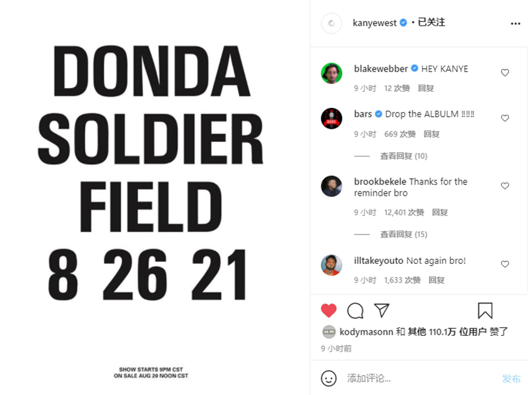 同时为了配合《DONDA》专辑的的发售,侃爷还清空了自己的 INS,并且接连其举办了两场 4 万多人的试听会。