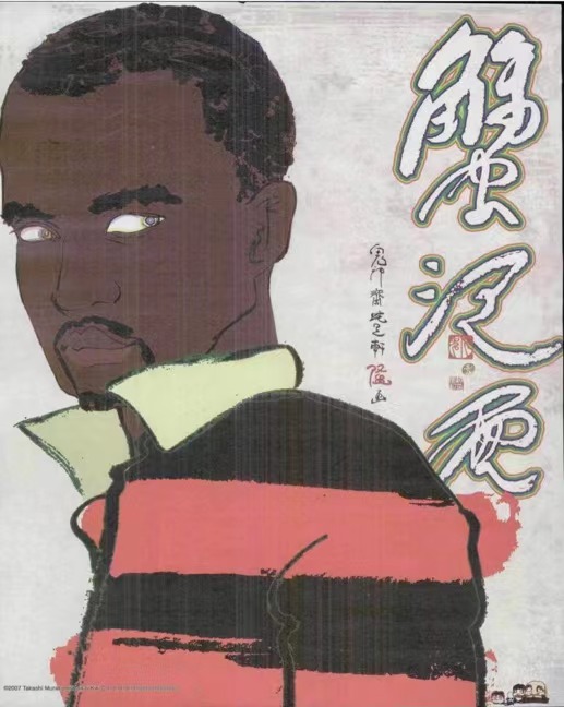 这张画其实是多年前村上隆为坎爷创作的作品,旁边的三个字则是侃爷名字 Kanye West 对应的日语:蟹江西。