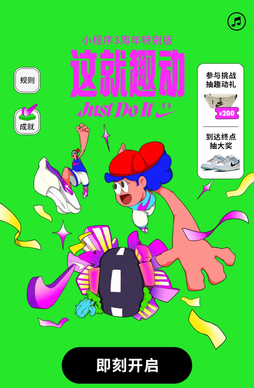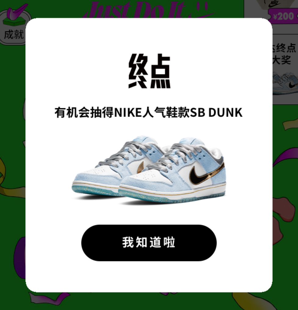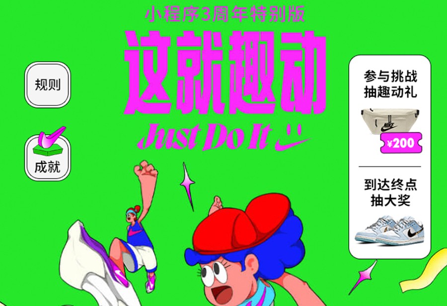 最近 Nike 就做了一个小程序 3 周年特别版,类似互动小游戏,所有人都能参与还有机会收到各种奖品。