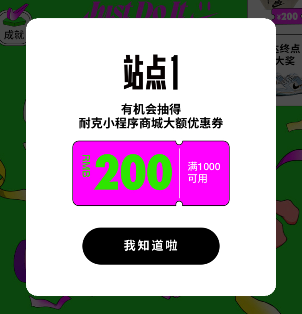 25 里程有机会抽取耐克小程序商城的 200 元优惠券,60 里程有机会抽取 Nike 腰包,到达终点 100 里程即可参与冰雪奇缘 Sean Cliver x Nike SB Dunk Low 的抽奖。