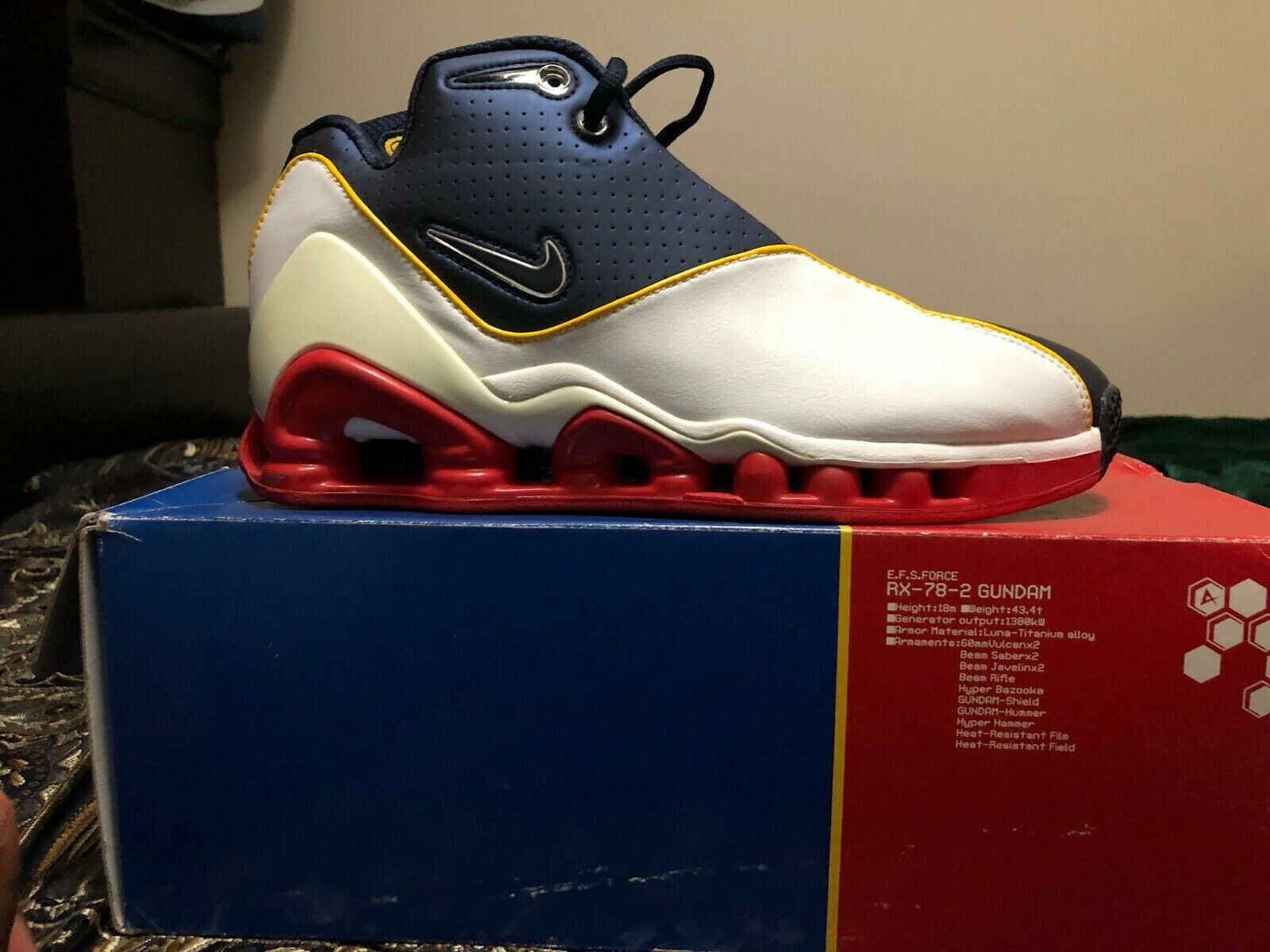 其实早在 2003 年 Nike 就与《机动战士高达》有过跨界合作。将元祖两大主角阿姆罗与夏亚的经典机体配色,赋予文斯·卡特签名战靴 Nike VC2 及 Nike Air More Uptempo 中。