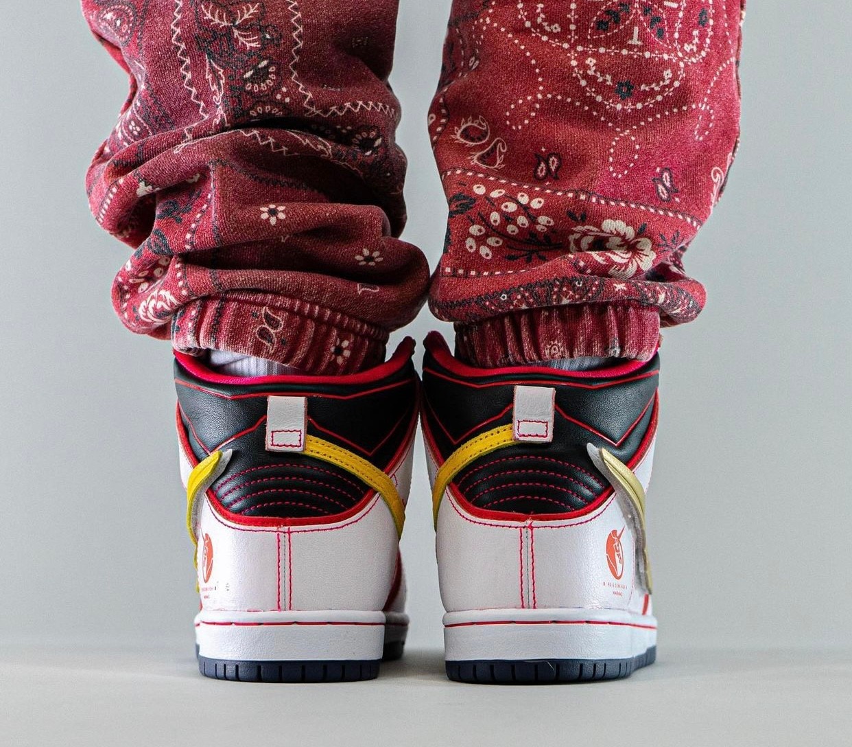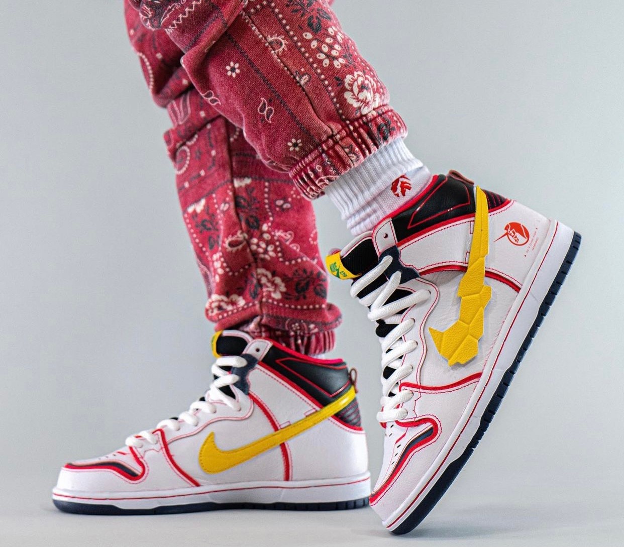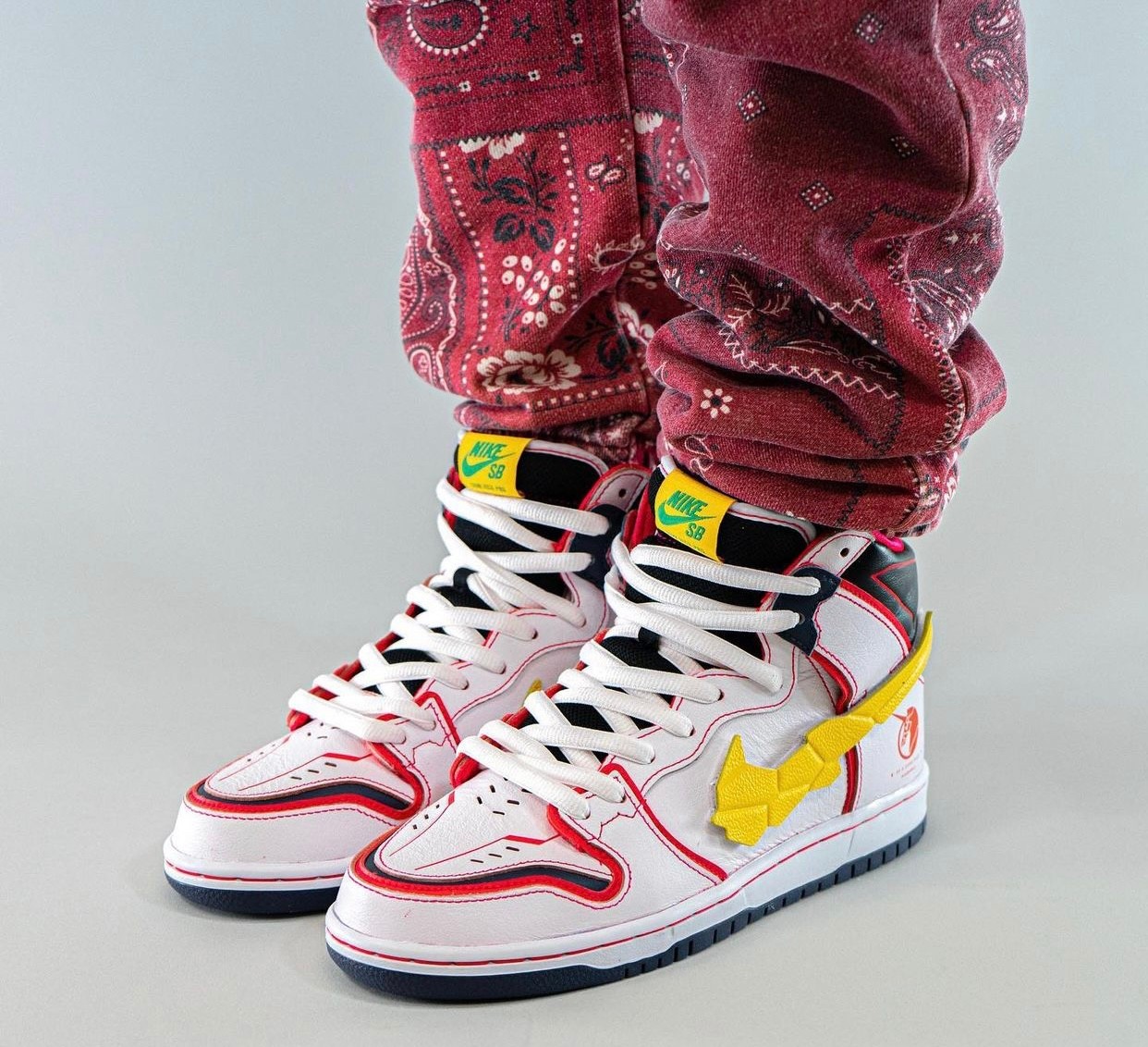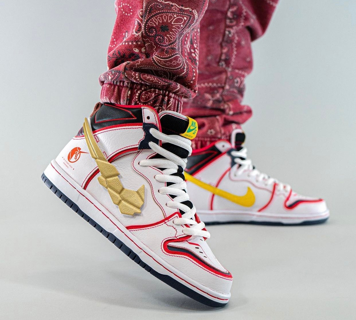 采用动画中觉醒后装甲全开造型示人,最大亮点除肩甲点缀 NIKE SB 涂装外,双脚则改以双方 Dunk SB Hi 联名鞋造型示人,进一步彰显双厨狂喜的梦幻联动。