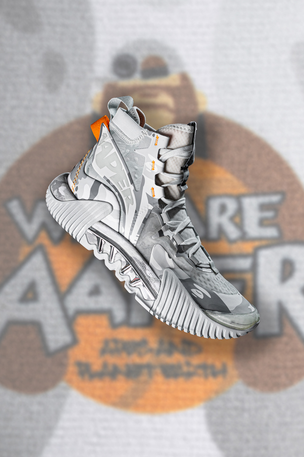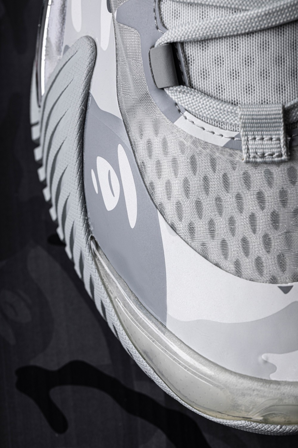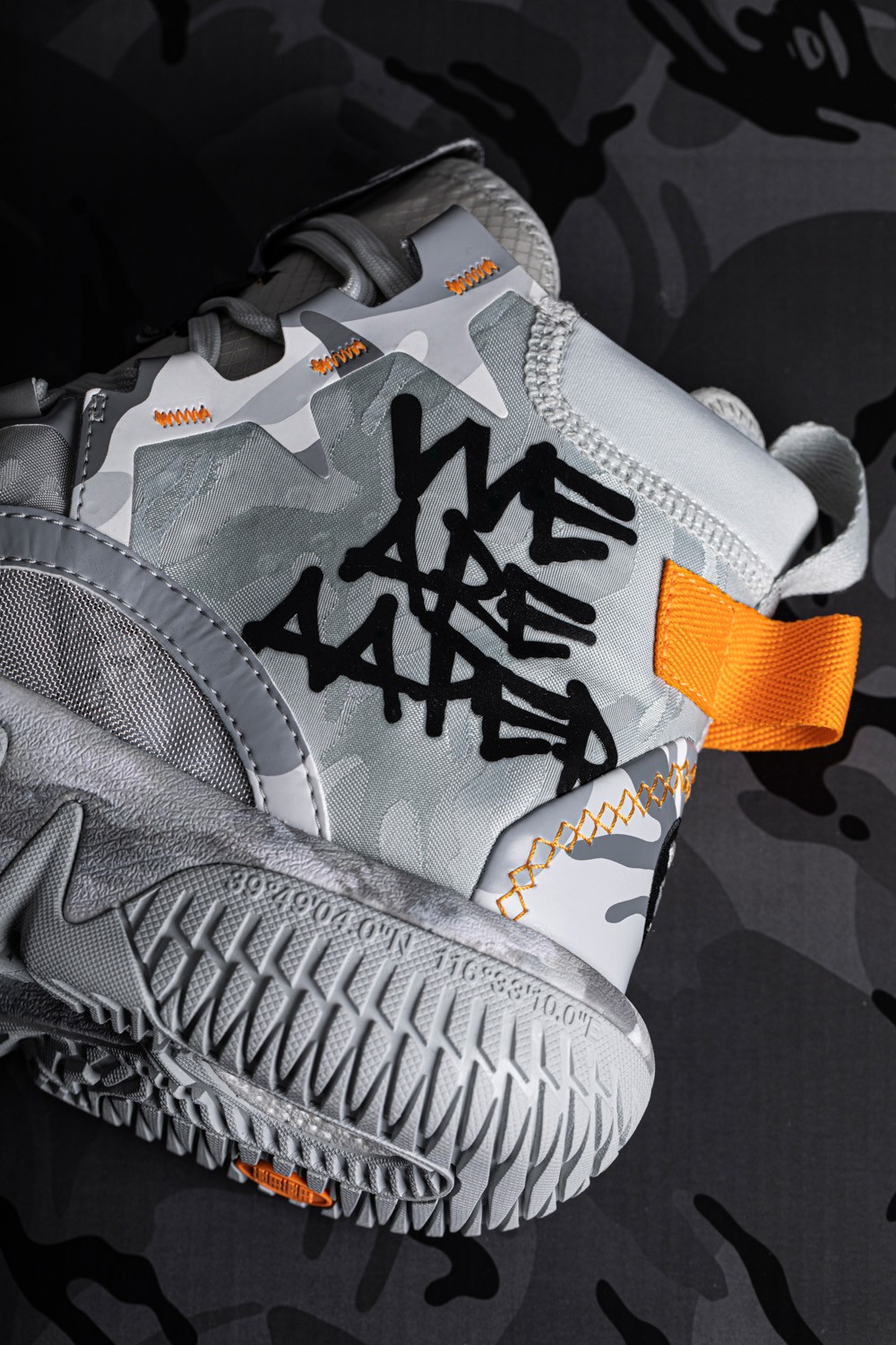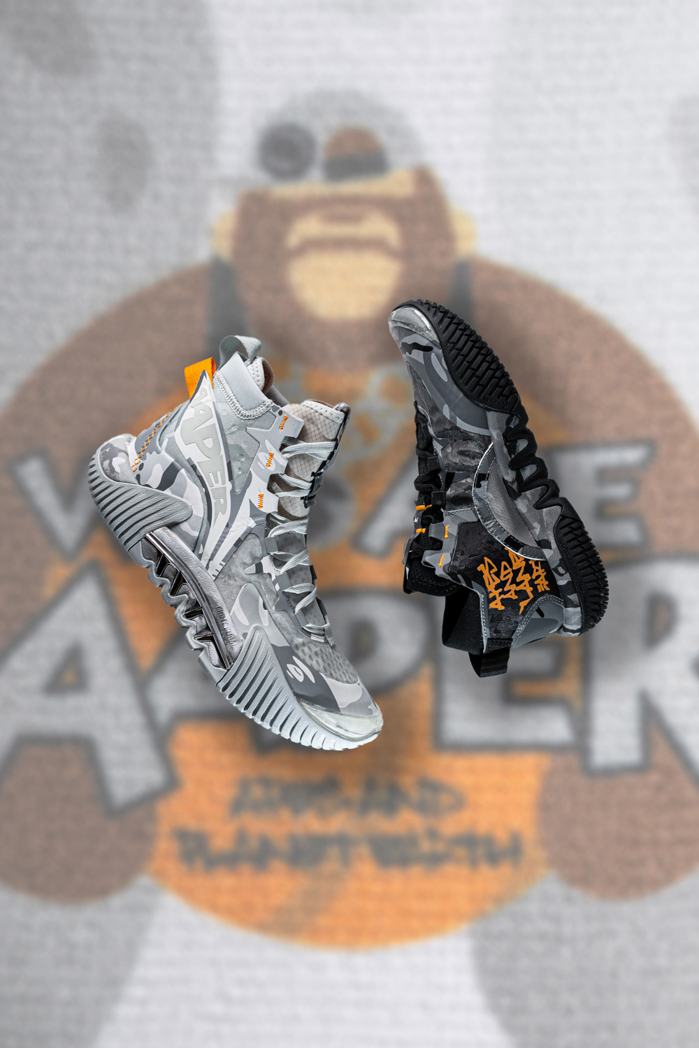高帮款以银灰色呈现,鞋身覆盖猿人头迷彩和 AAPER 字样。