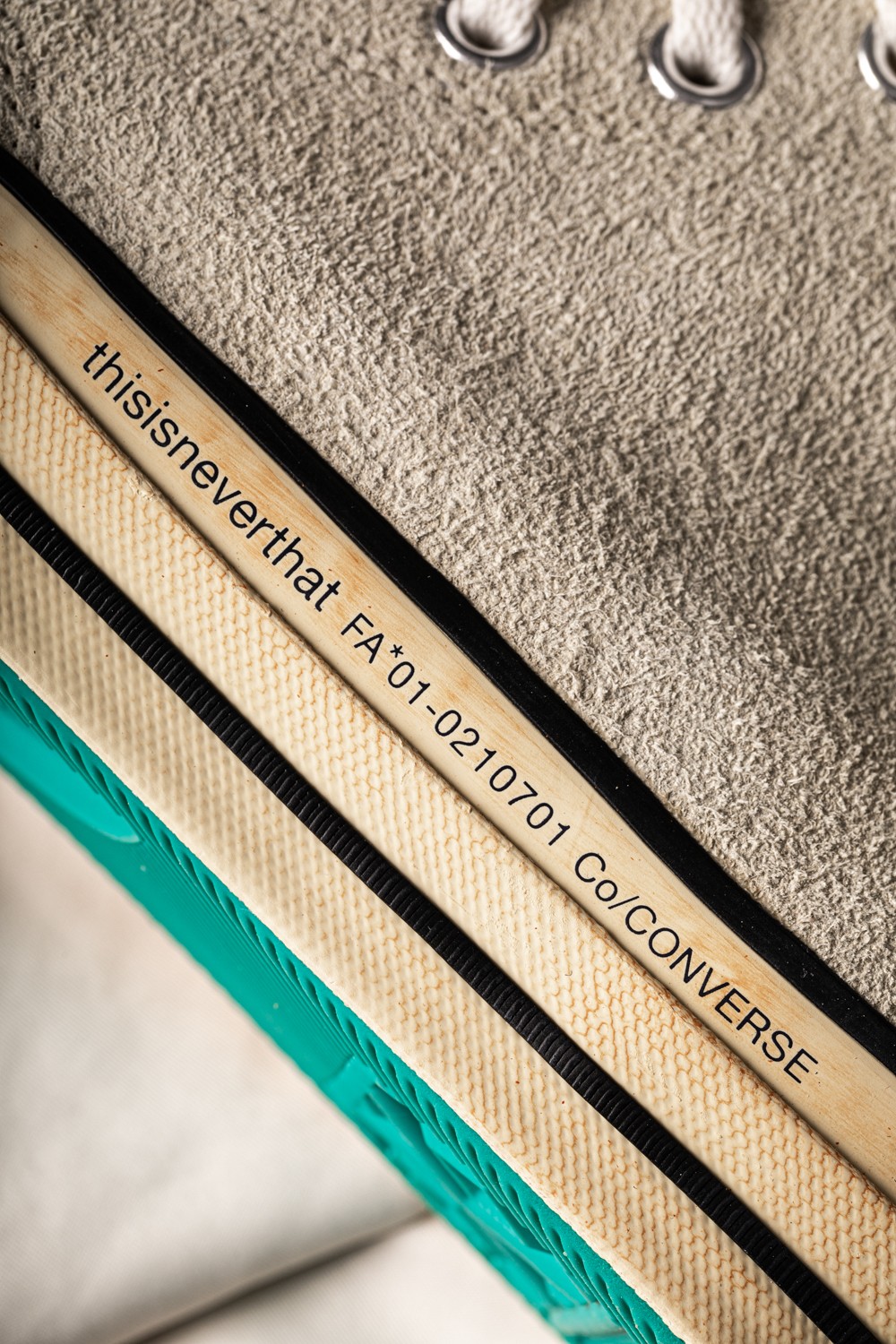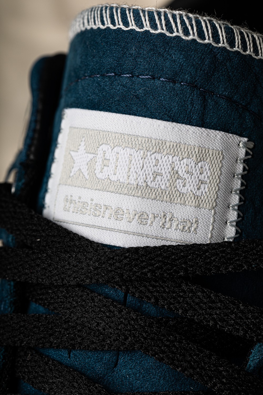 鞋舌标签采用 Converse 与 thisisneverthat 的融合 Logo 去代替传统标志,彰显联名身份。