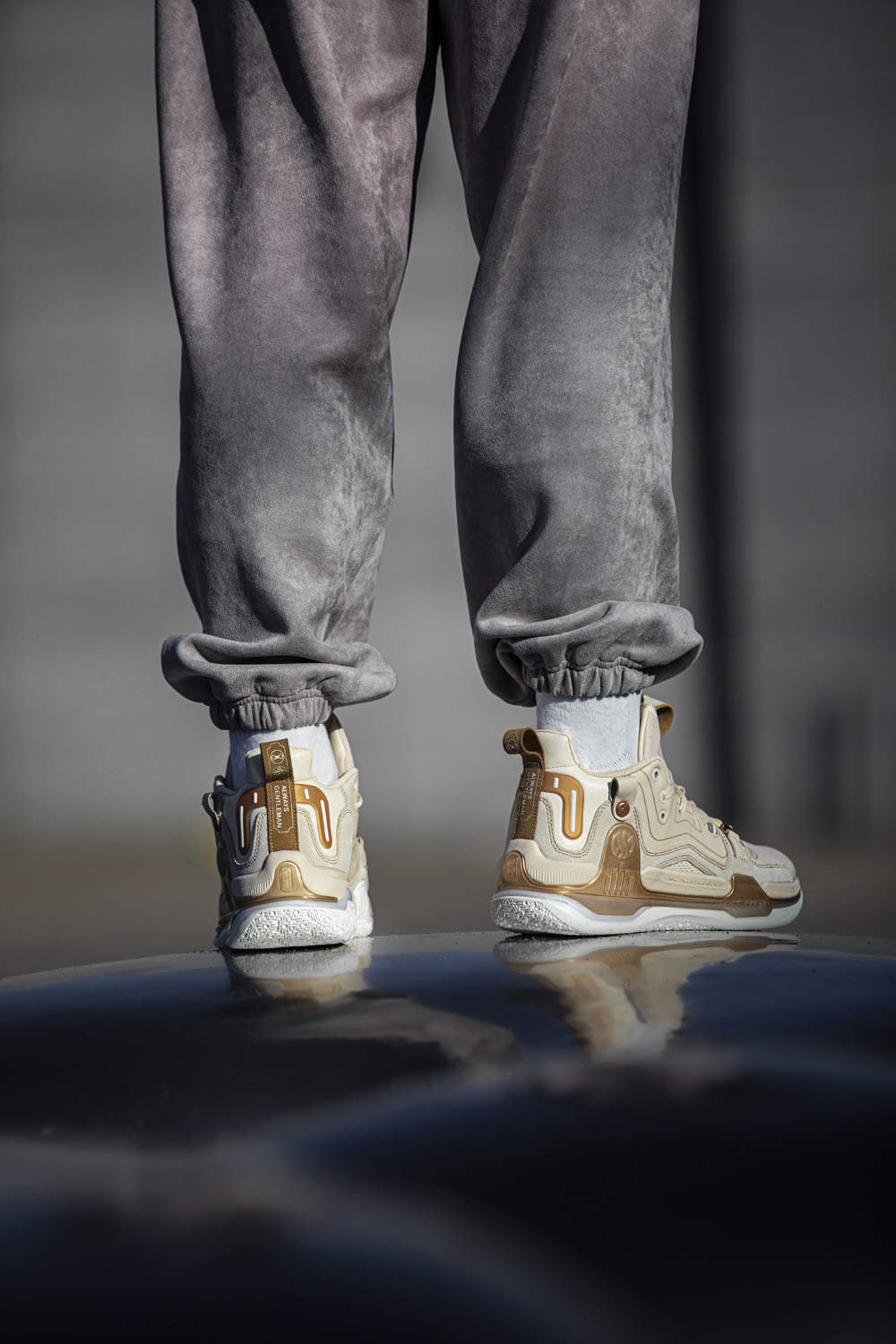 除了上面的「冰刀」配色外,还有一双与之配套的 AG1 Pro LUX「荣耀」,灵感来自戈登纹身中的皇冠,代表了他对这个世界的敬畏,也代表了他不断努力争取荣耀的决心。