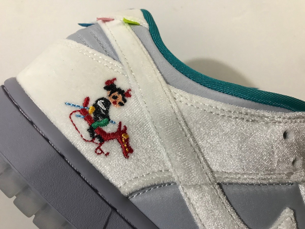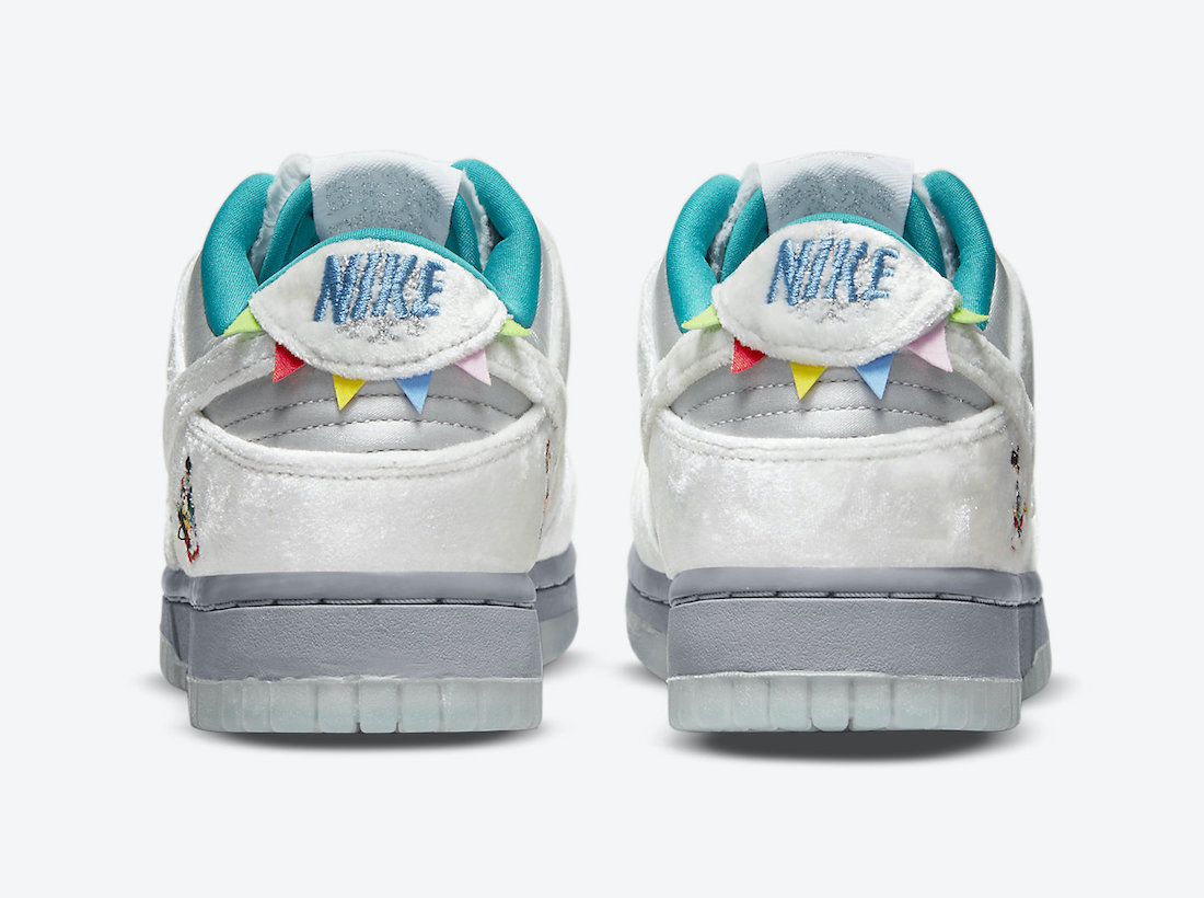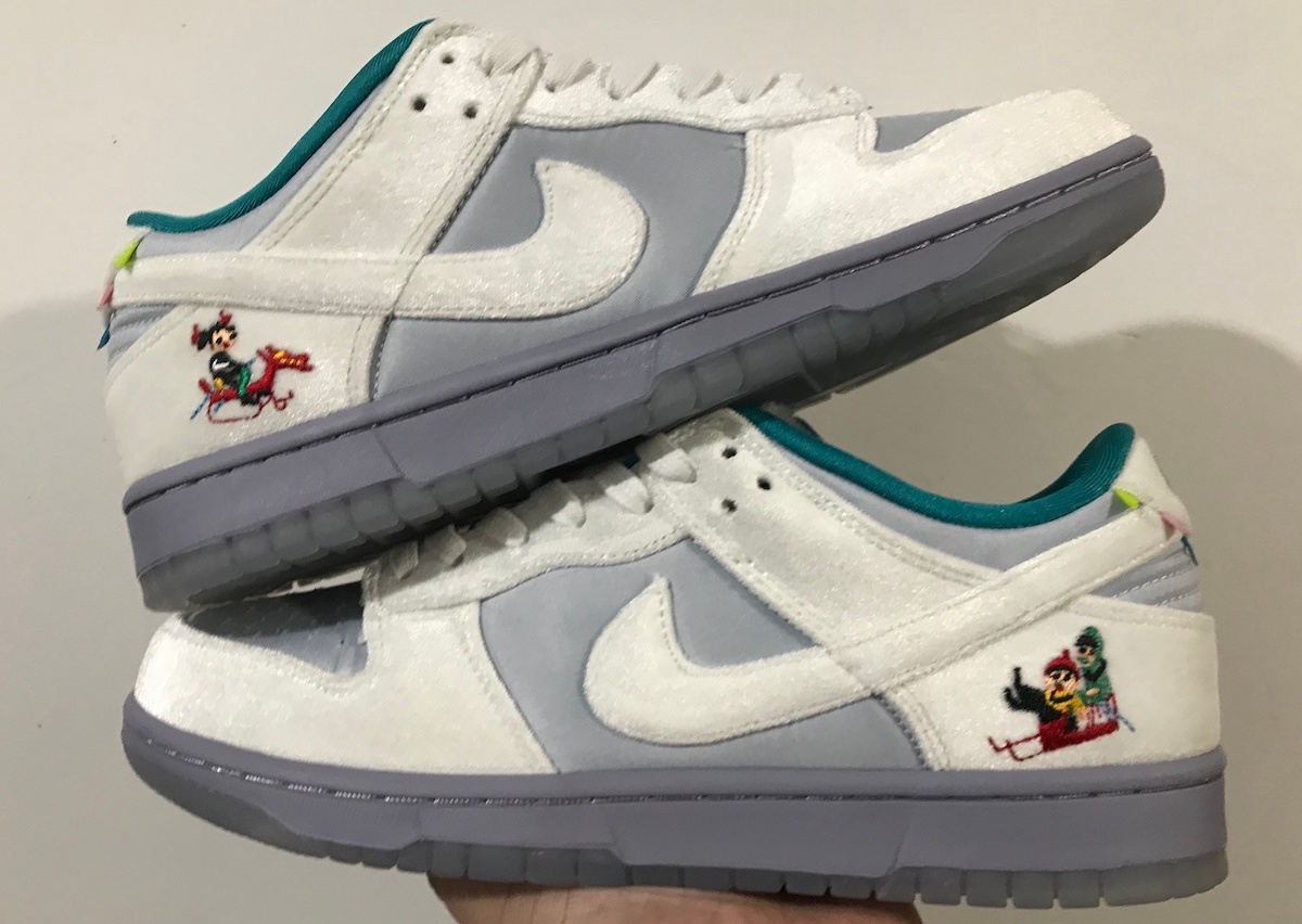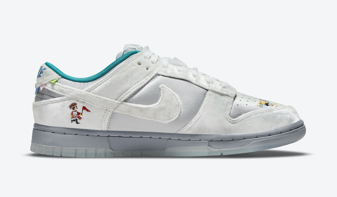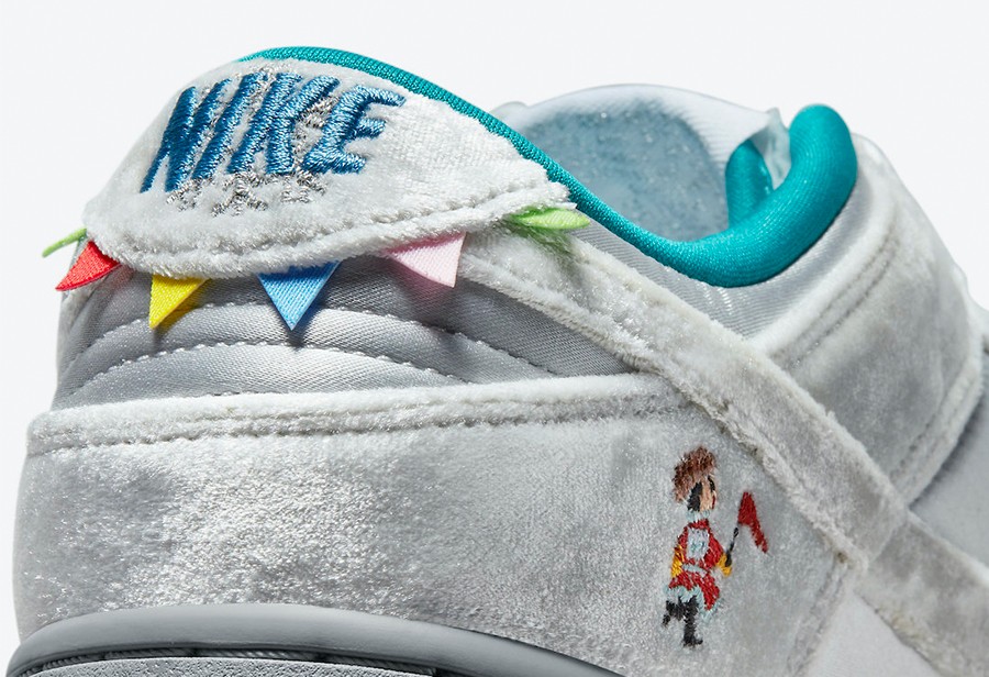 整双鞋的设计像是把「情人节」和「冰雪奇缘」两双超人气 Dunk SB Low 合二为一,以白灰色为主调,鞋面由丝绒、绸面打造,呈现出银灰色的质感,搭配鞋舌上的人造兔毛,增添了毛绒绒的可爱气质。