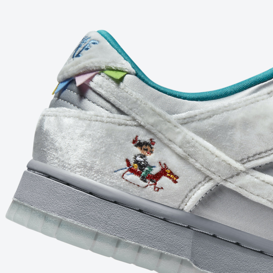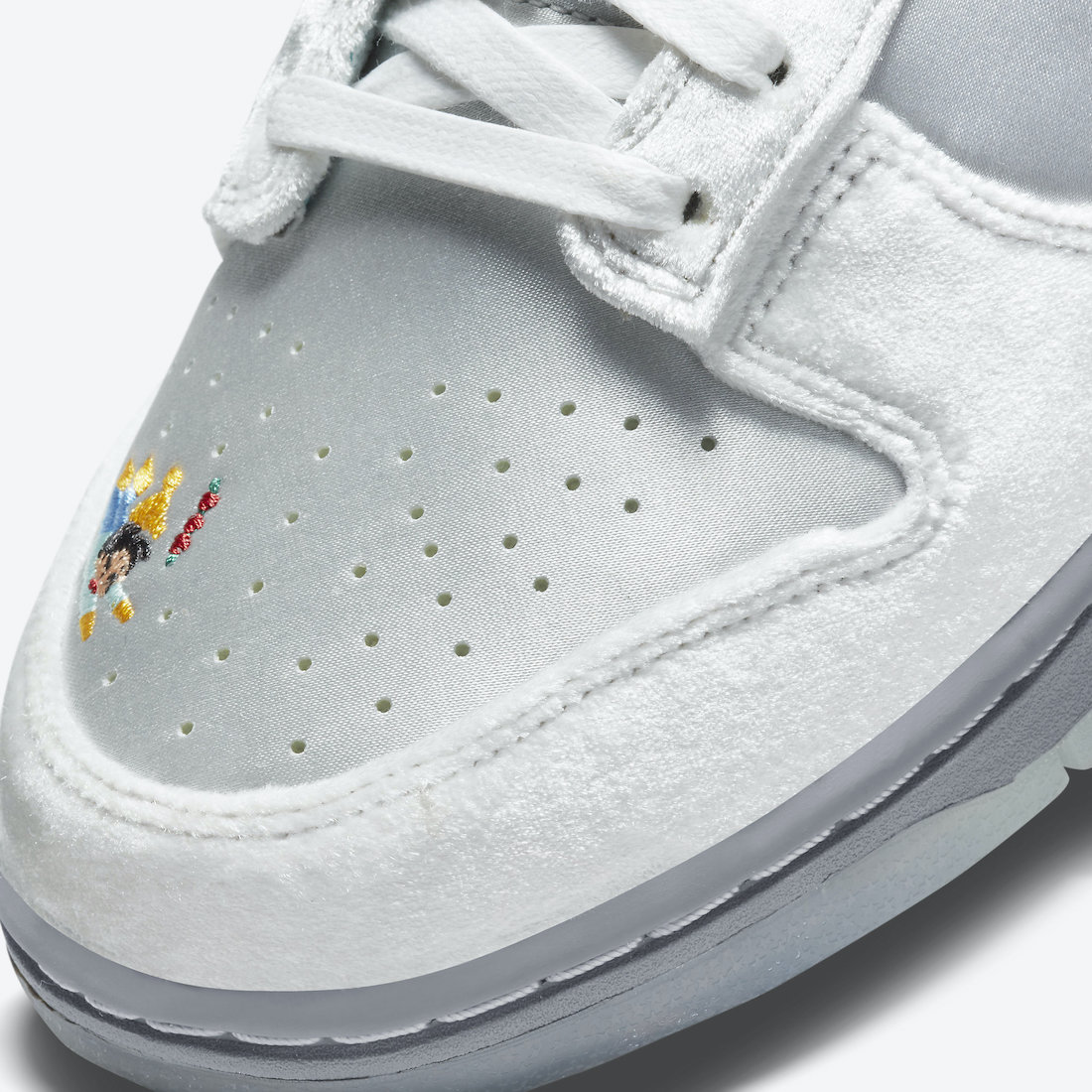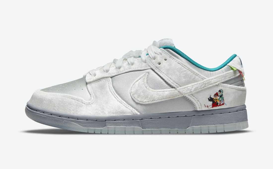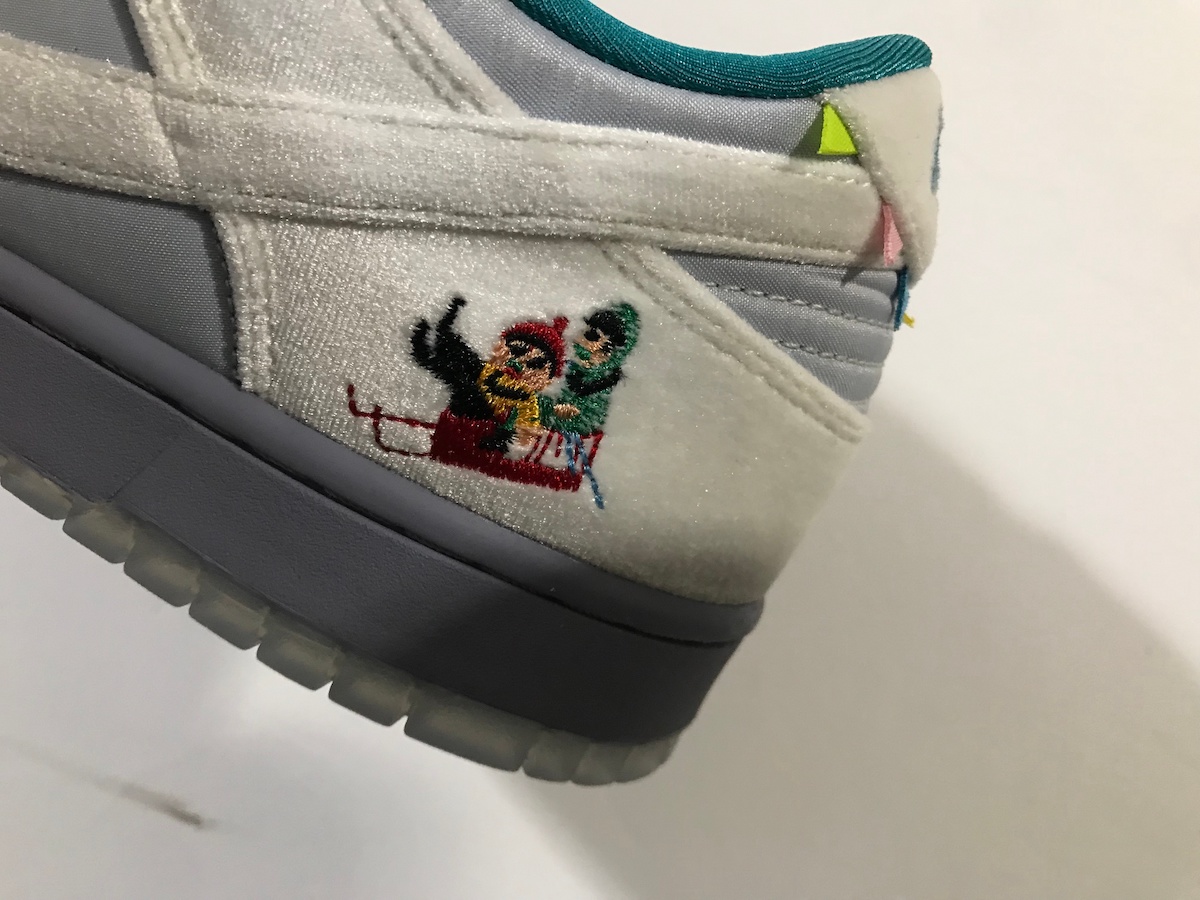 整双鞋的设计像是把「情人节」和「冰雪奇缘」两双超人气 Dunk SB Low 合二为一,以白灰色为主调,鞋面由丝绒、绸面打造,呈现出银灰色的质感,搭配鞋舌上的人造兔毛,增添了毛绒绒的可爱气质。
