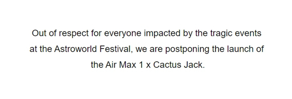 就连 Nike 都挡不住舆论的轰炸,赶快发声明推迟一系列 Travis Scott 联名的发售,其中就包括这双 Air Max 1。