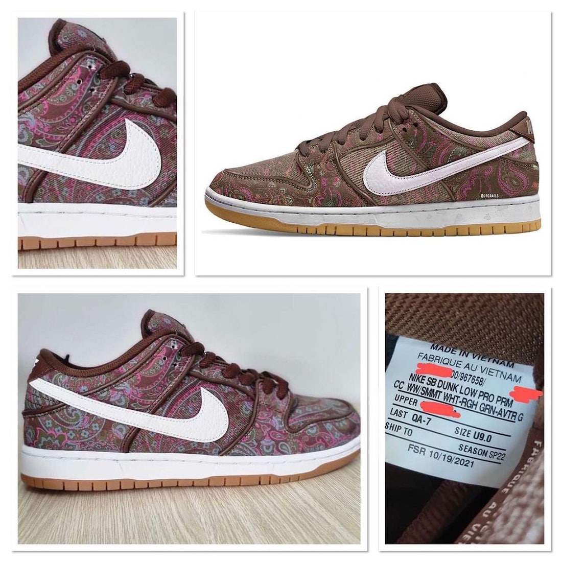 整双鞋采用 Nike SB Dunk Low 为设计蓝本,鞋面采用棕色作为主调,辅以酒红色腰果花图案,带来极为醒目的视觉效果。