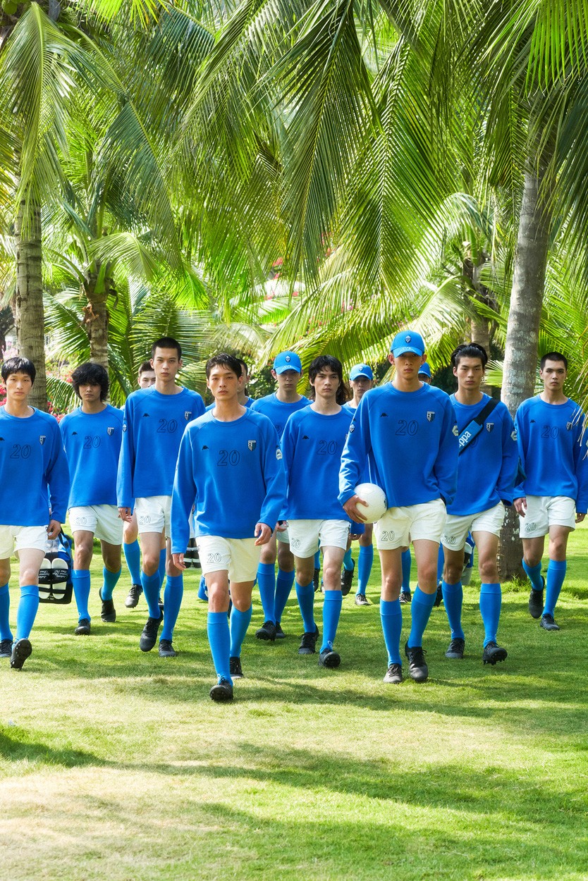 意大利国家足球队的蓝与棕榈、草地构成和谐的色彩,将西装与球衣 T 恤、衬衫相结合,试探运动服与正装的边界,更向球场记忆致敬。