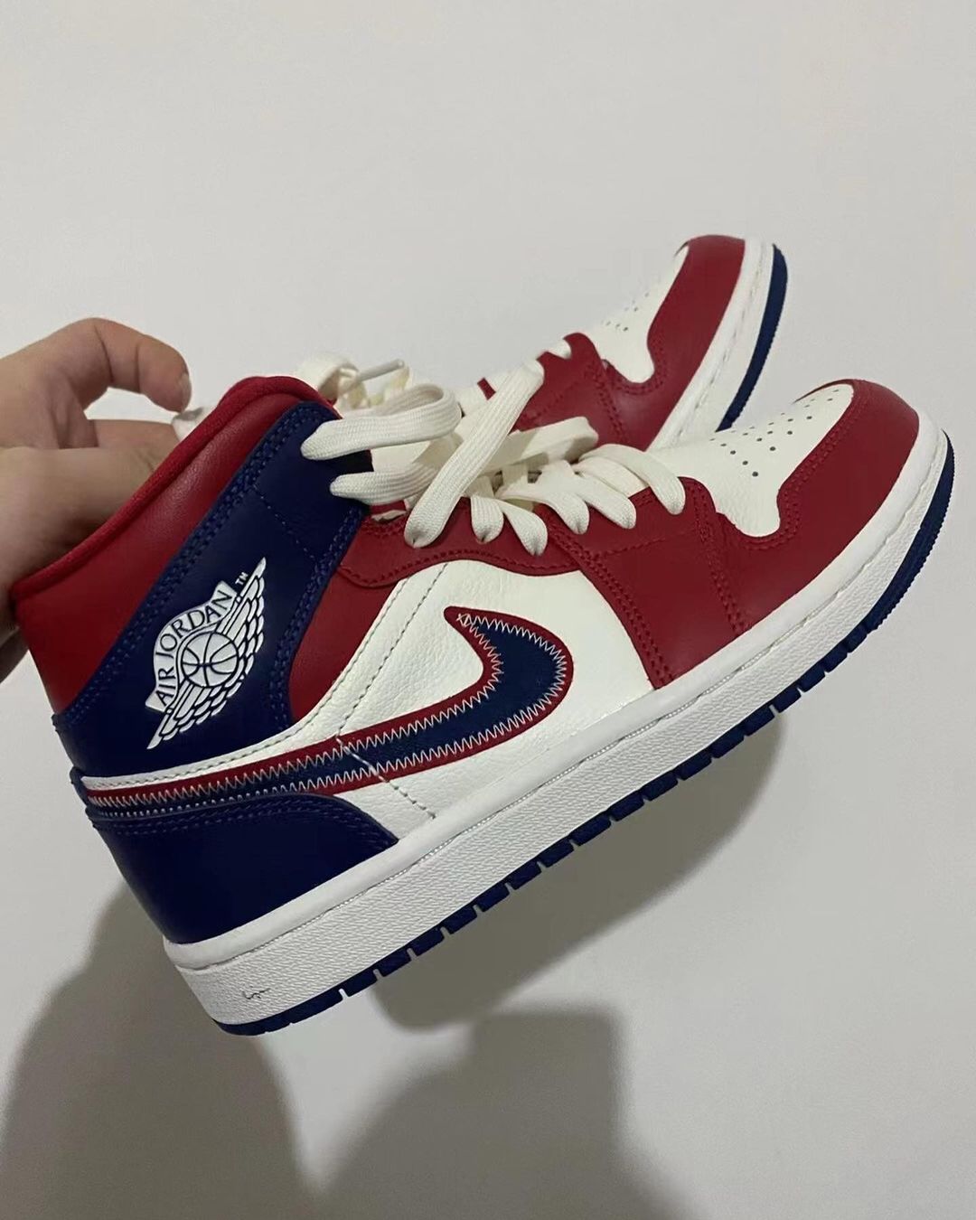 另外还有一款蓝红配色的 Air Jordan 1 Mid,鞋身前半部分白用白红配色装扮,鞋帮以及后跟则是深色海军蓝。