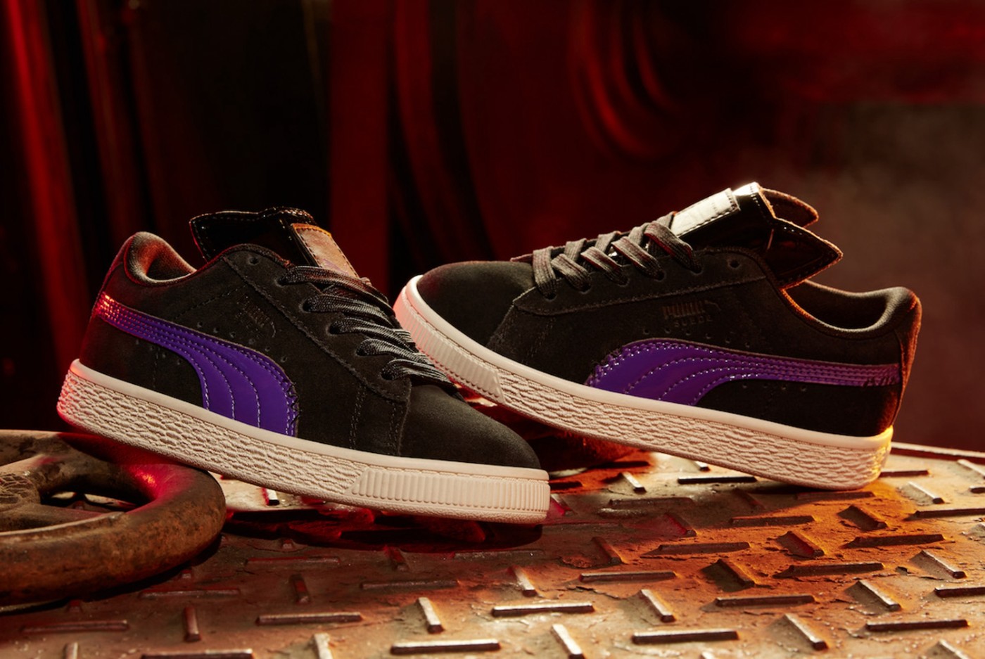 系列鞋款将包括以 “猫女” 为配色灵感的 PUMA Suede 和 PUMA RS-X ,两双鞋面以黑色为主体, RS-X 的中底从鞋头到鞋跟使用了由白到紫的渐变配色,而 Suede 使用紫色的 Logo,更显神秘感。