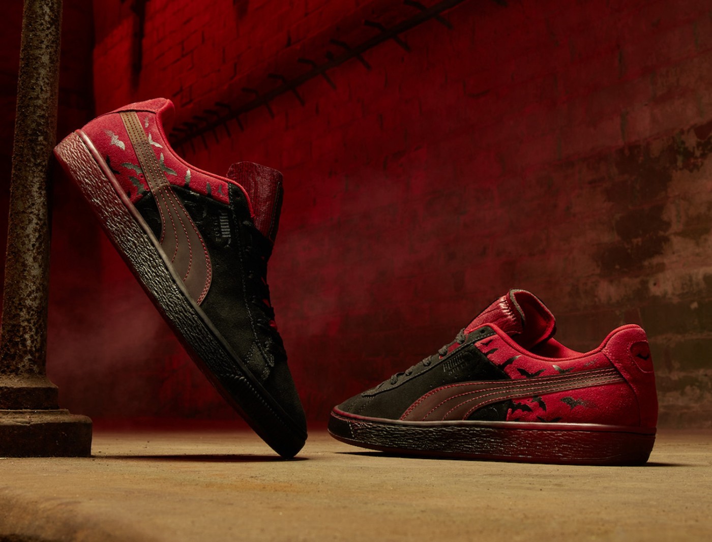 一双以蝙蝠洞为配色灵感的 PUMA Suede,鞋身使用黑红双色拼接,在后跟红色部位还有蝙蝠飞出洞穴的剪影。