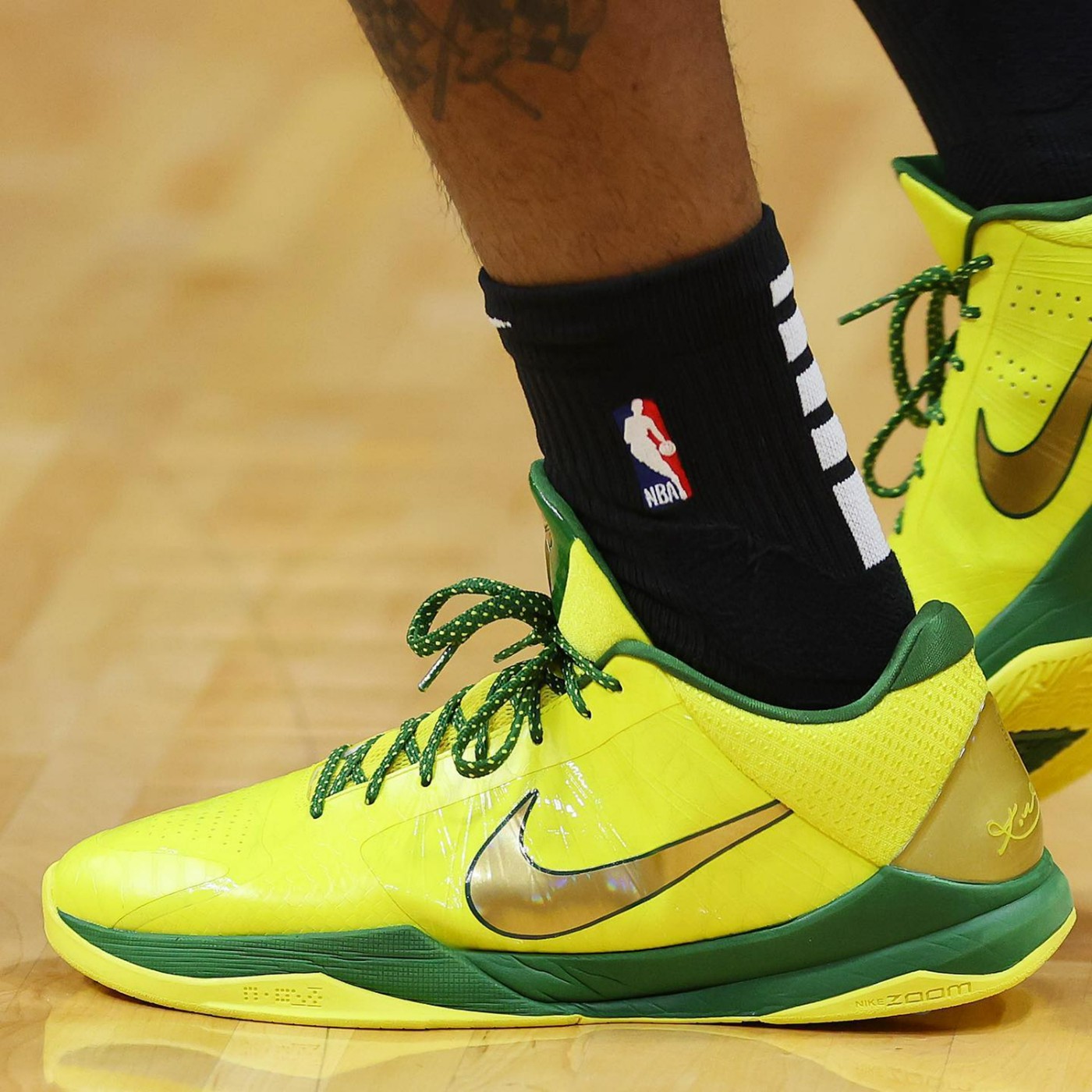 在上周的 NBA 赛场,塔克被媒体拍到上脚了一双疑似俄勒冈配色的 Nike Kobe 5 Protro PE。