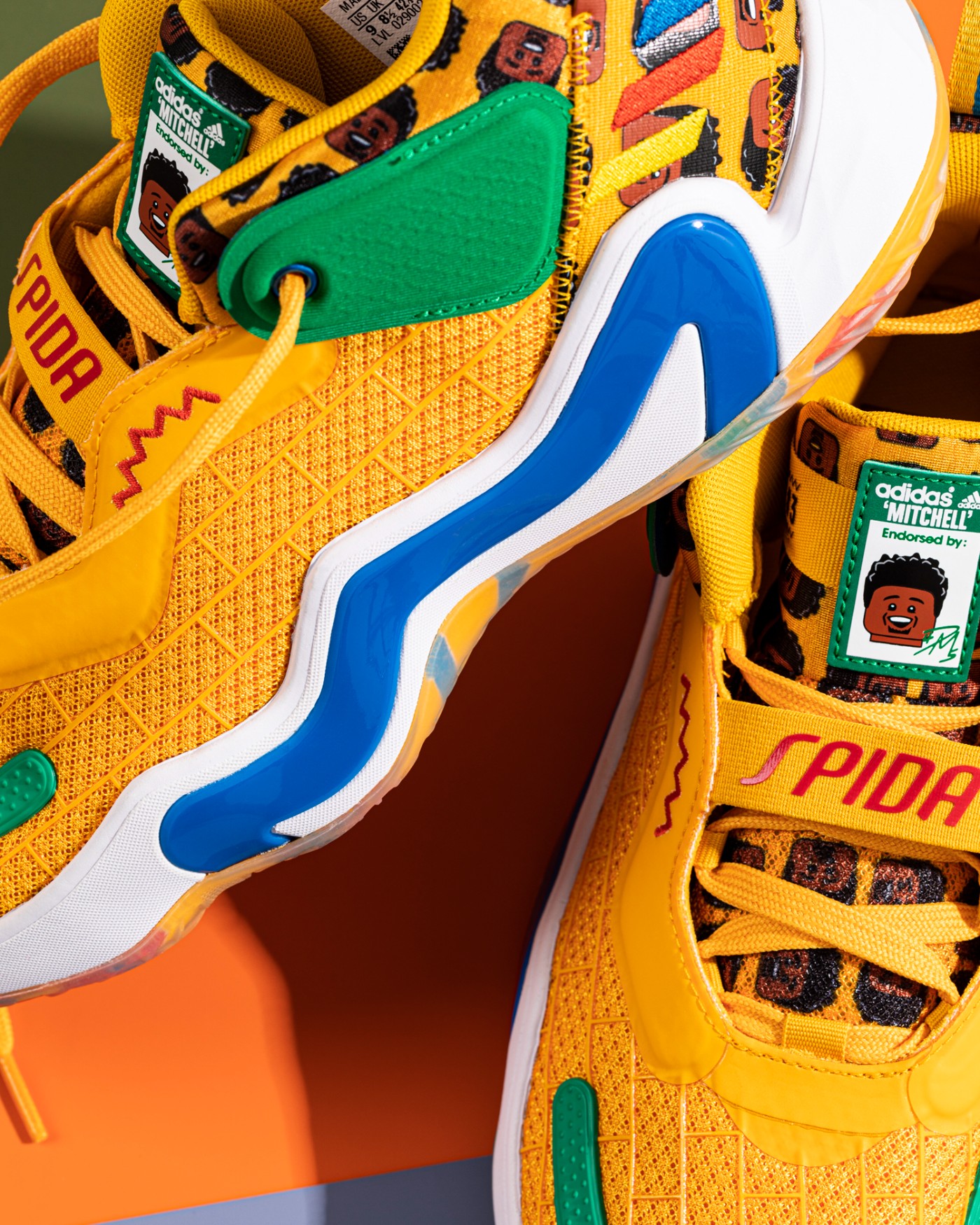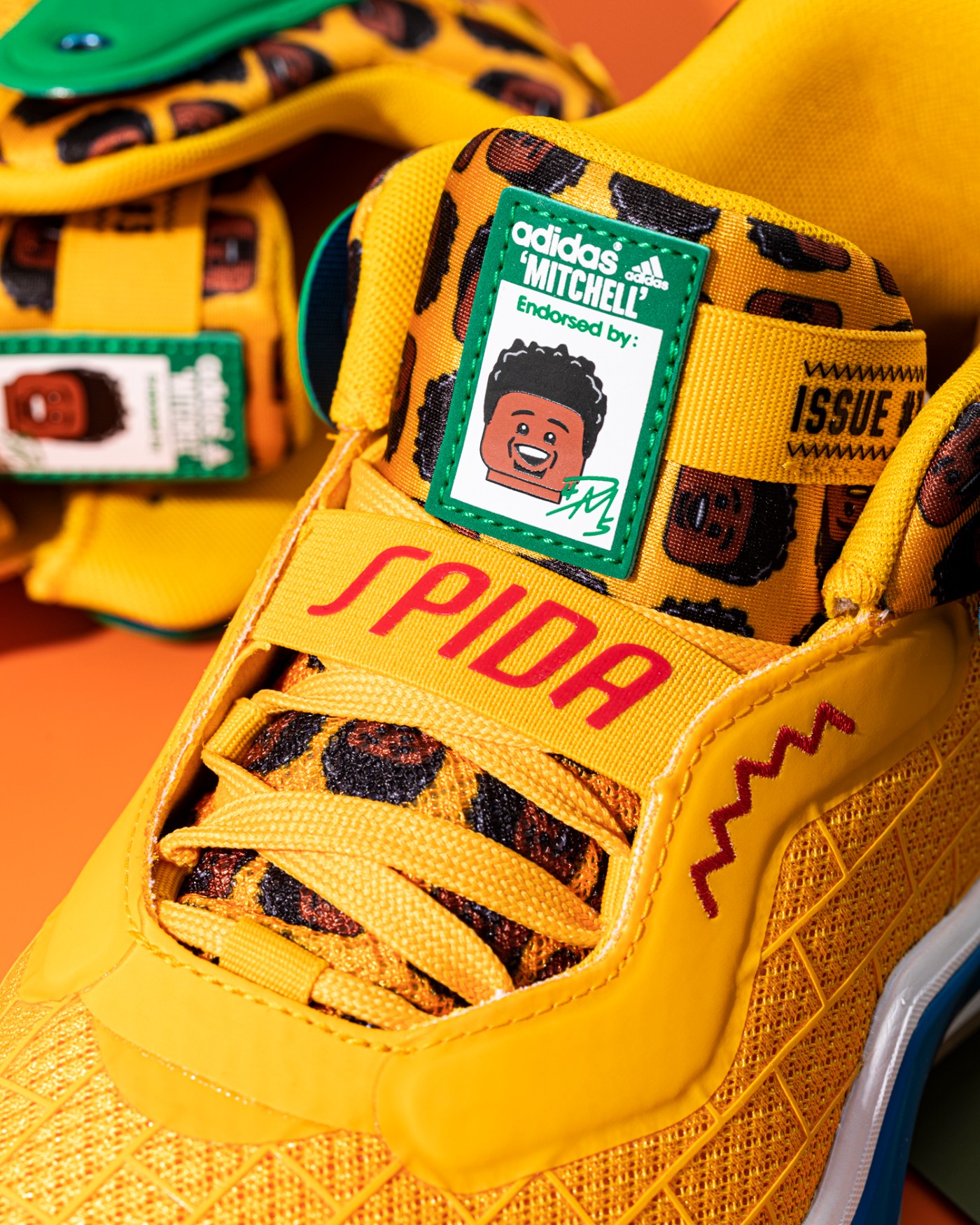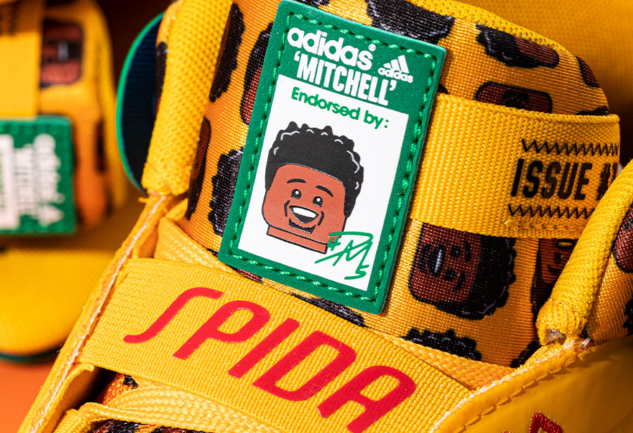 在鞋舌顶端还有一块绿色的标签,写着 adidas,Mitchell,以及乐高头像和米切尔的个人签名。