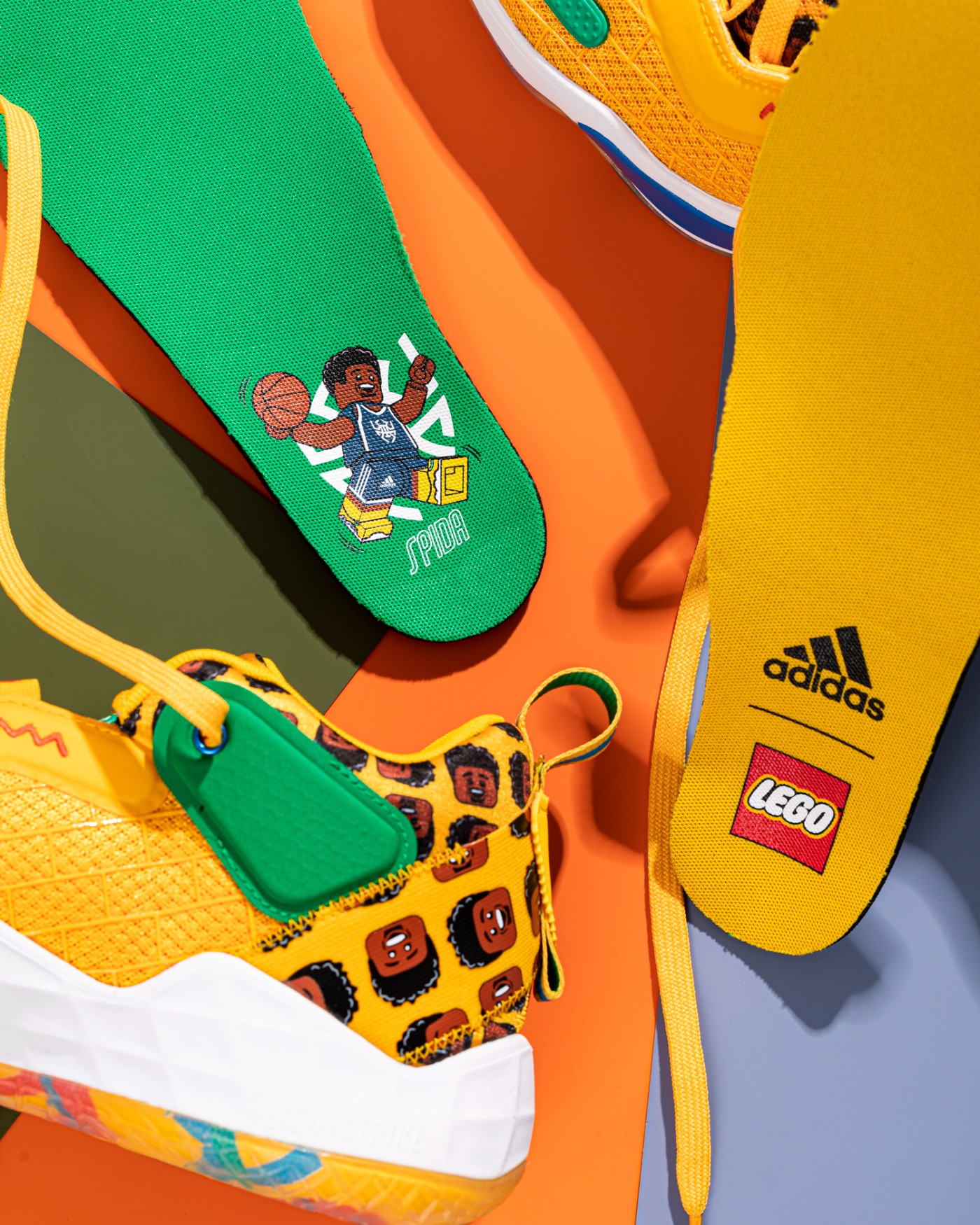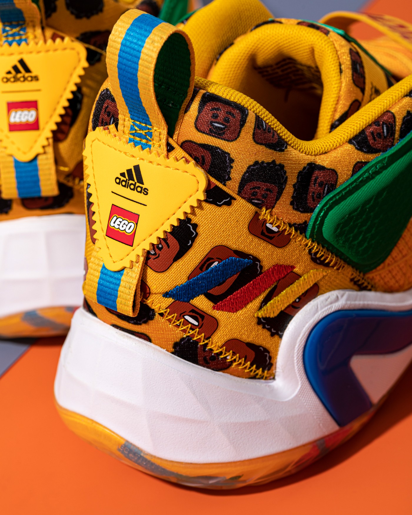 后跟提环处的标签写有 adidas 和 Lego 的 Logo,展现出球鞋的联名身份。