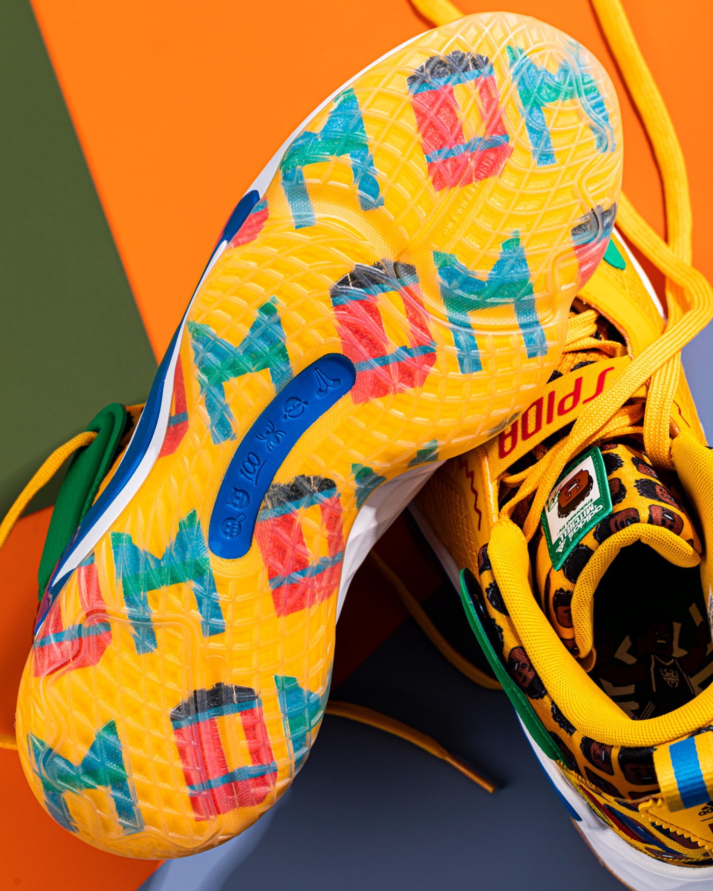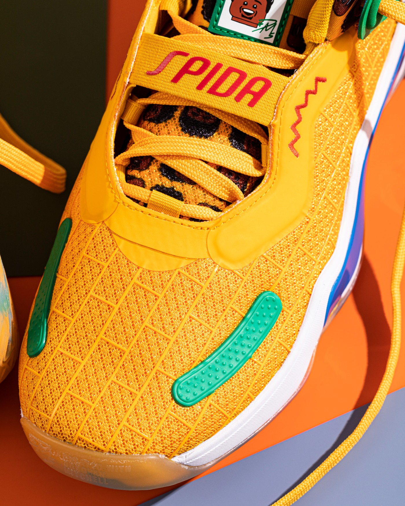 鞋面使用纯黄配色,鞋面上的热压纹路灵感来自于米切尔的外号 “蜘蛛侠”,热压条像极了蜘蛛侠战衣上面的网格。