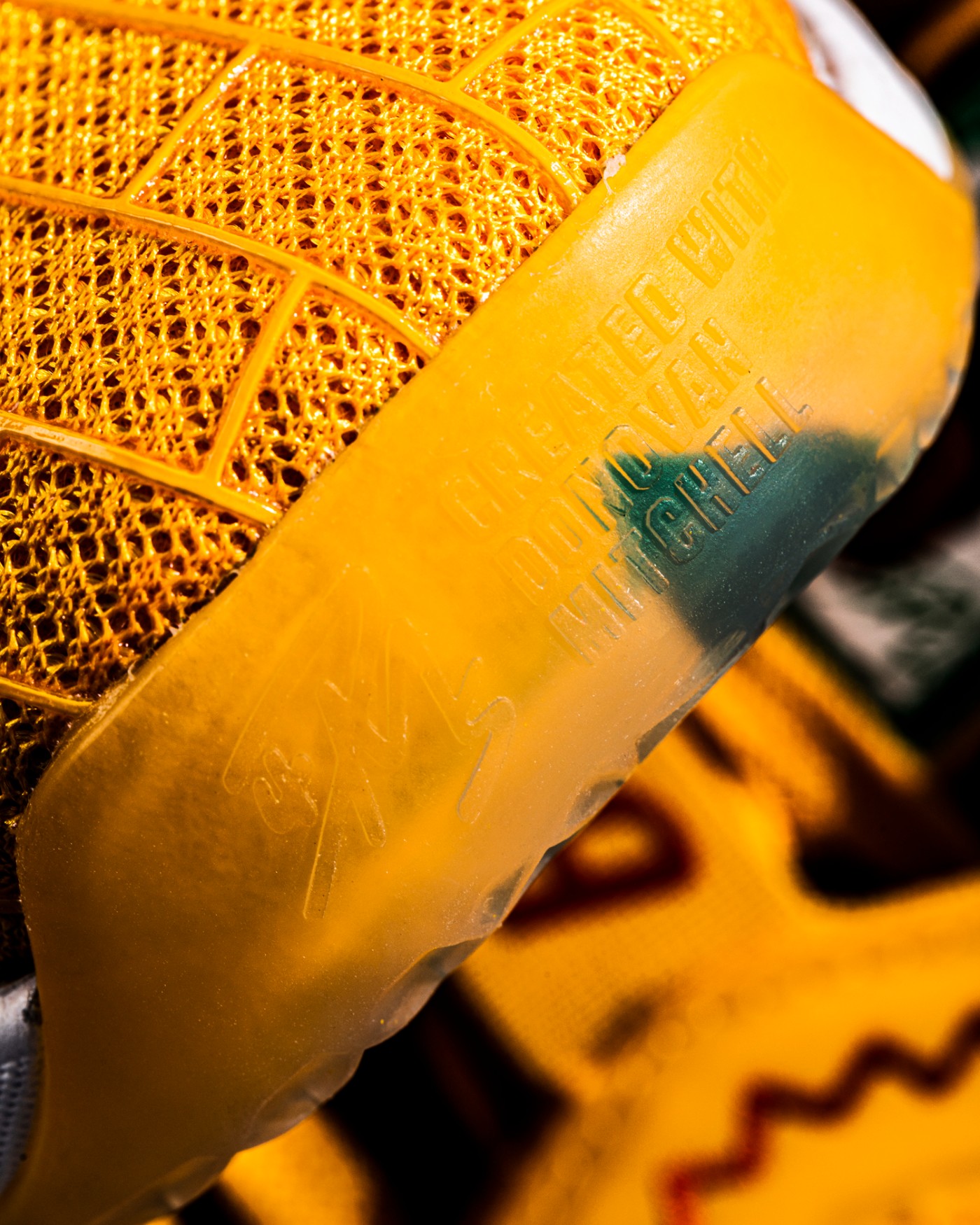 外底使用透明水晶大底,透过水晶底能看到纯黄色的背景上写满 “DM” 米切尔个人名字缩写的图案。