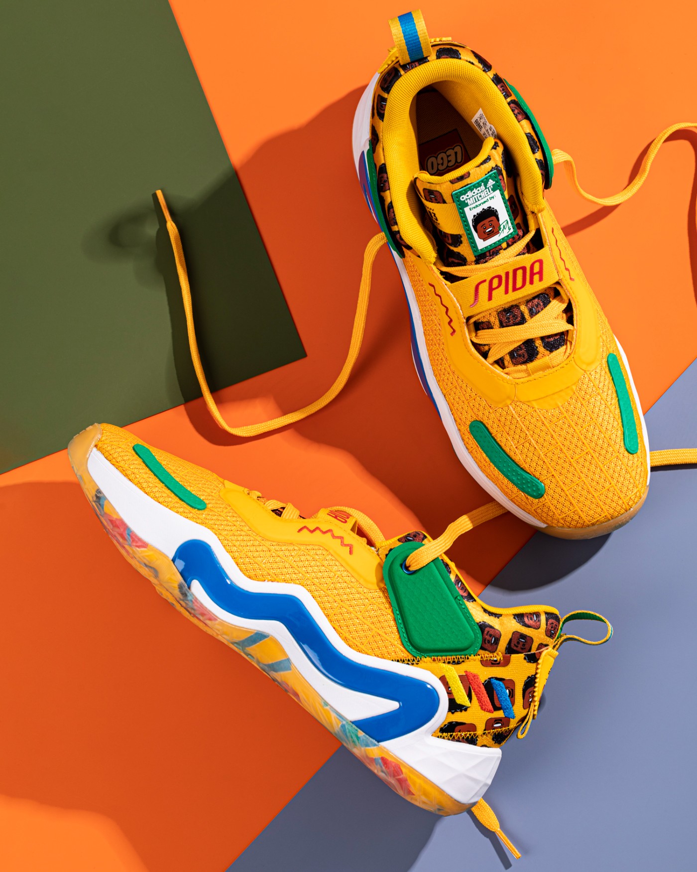 值得一提的是,本次联名鞋款的左右鞋垫采用鸳鸯设计,左脚使用纯绿色背景印有乐高风格米切尔人偶以及蜘蛛侠图标,右脚使用黄色背景印有 adidas 和乐高的 Logo。