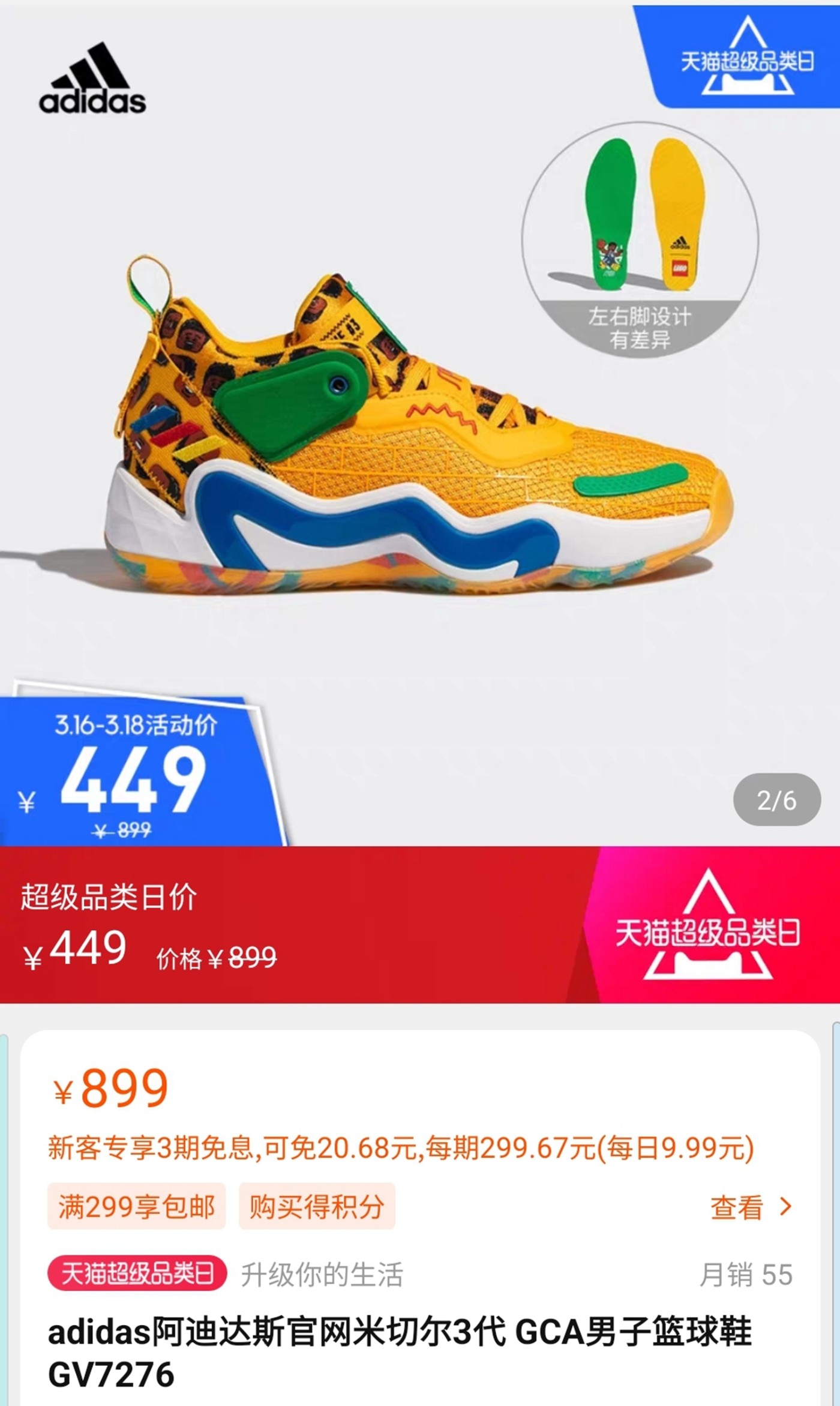 大家关心的发售信息,目前全新 adidas D.O.N. ISSUE #3 乐高联名款式现已在 adidas 官方旗舰店正式发售,发售价格 ¥899 元,3 月 16 日至 3 月 18 日活动价格只要 ¥449 元,喜欢的朋友不妨点击下方链接入手。