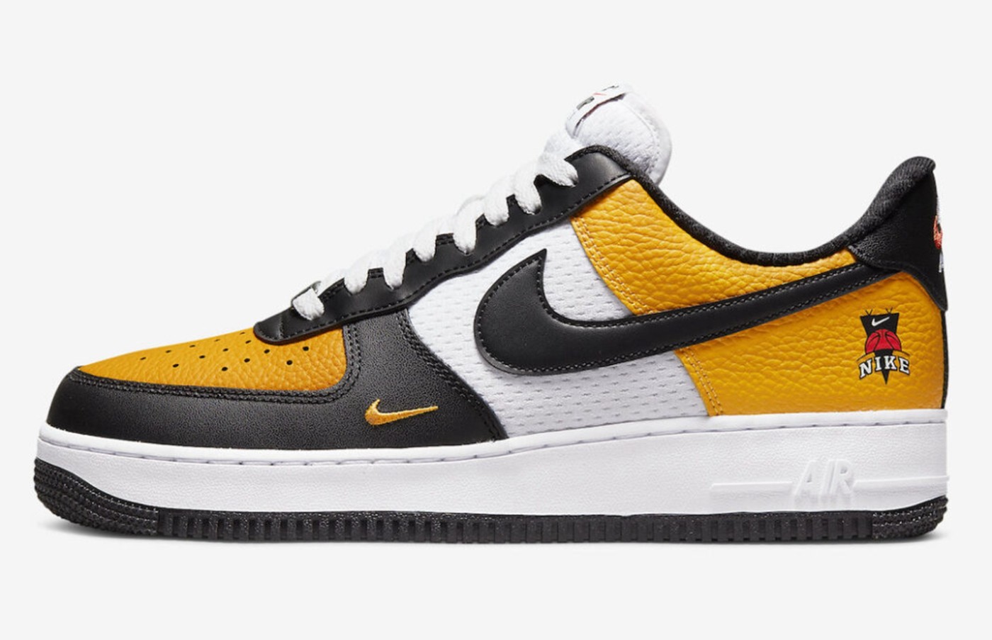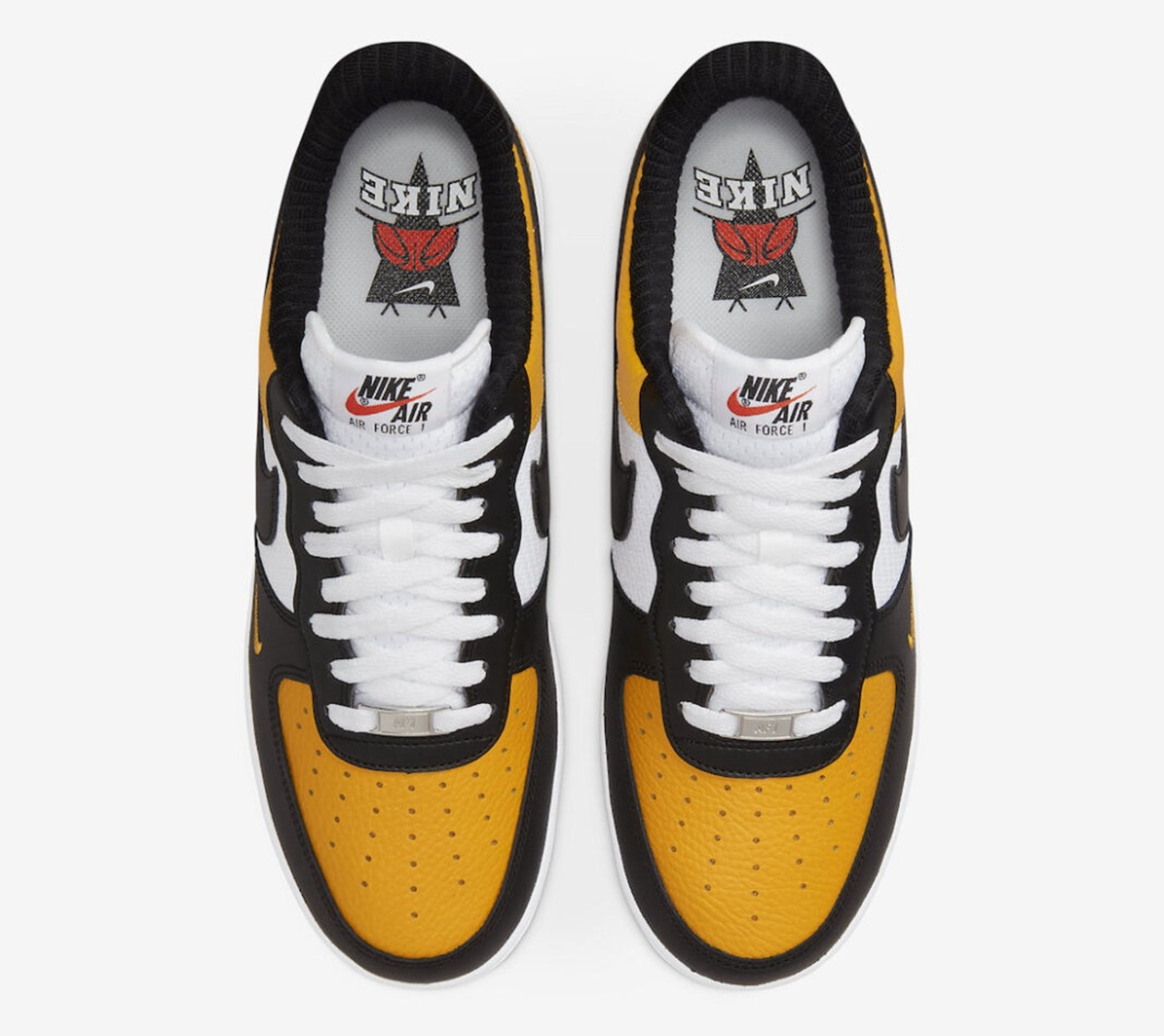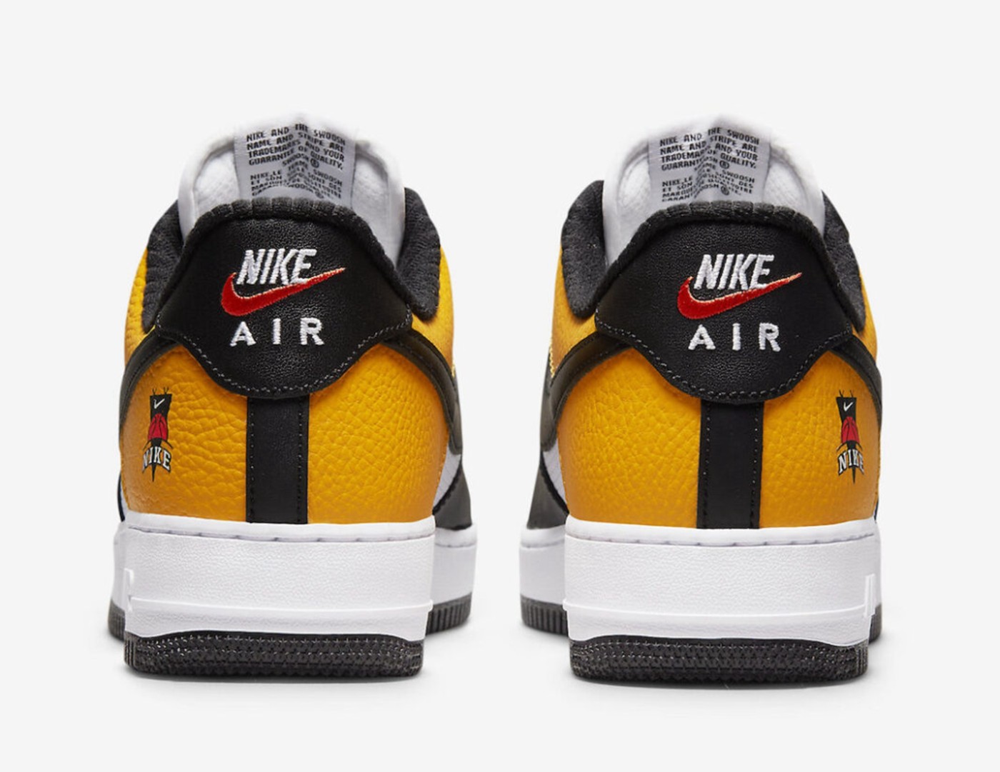 后跟部分与鞋头相同,使用了黄色荔枝皮材质,鞋跟外侧还有 Nike 与篮球的 Logo,这也表明 Air Force 1 这双鞋诞生之初也是球场上的实战利器。