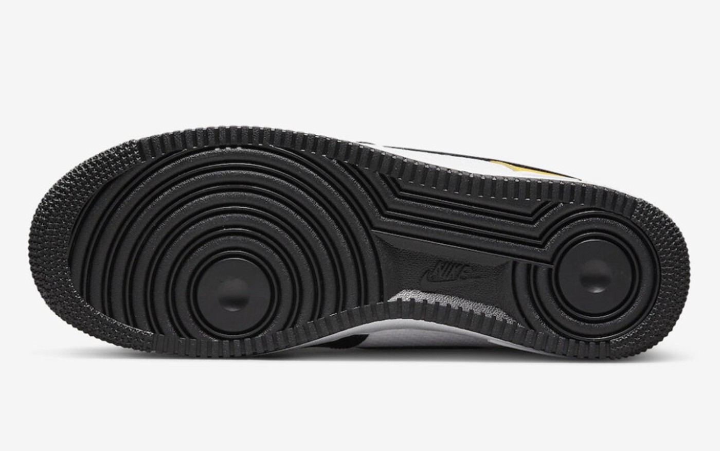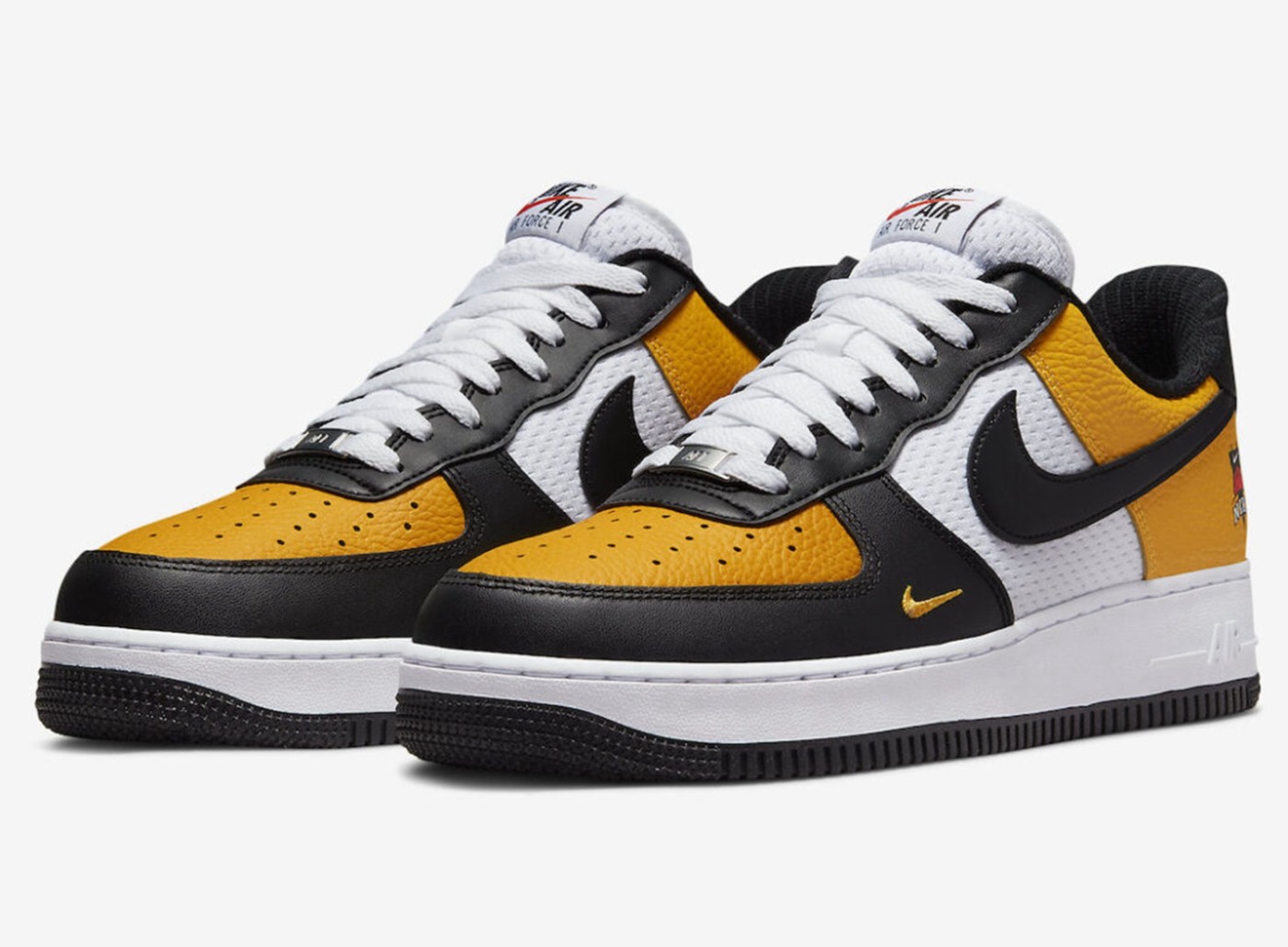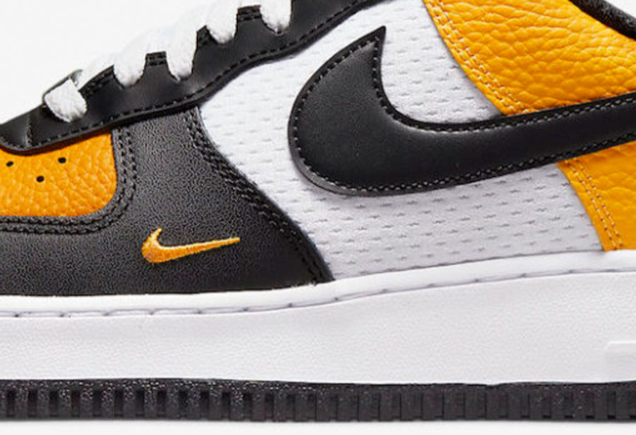 后跟部分与鞋头相同,使用了黄色荔枝皮材质,鞋跟外侧还有 Nike 与篮球的 Logo,这也表明 Air Force 1 这双鞋诞生之初也是球场上的实战利器。