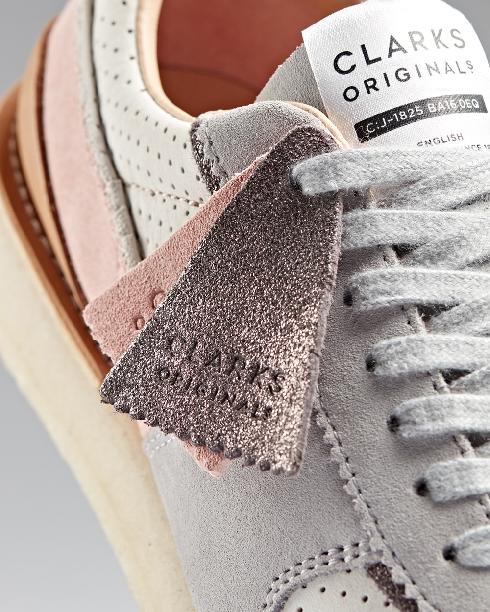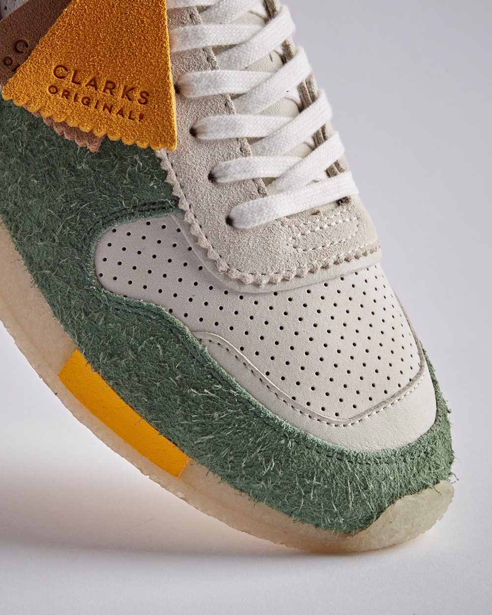 CLARKS ORIGINALs 所独有的高级感与精湛做工均得以传承,鞋身通过打孔皮革、翻毛皮革及亮面皮革共同构建,呈现出丰富的质感层次。