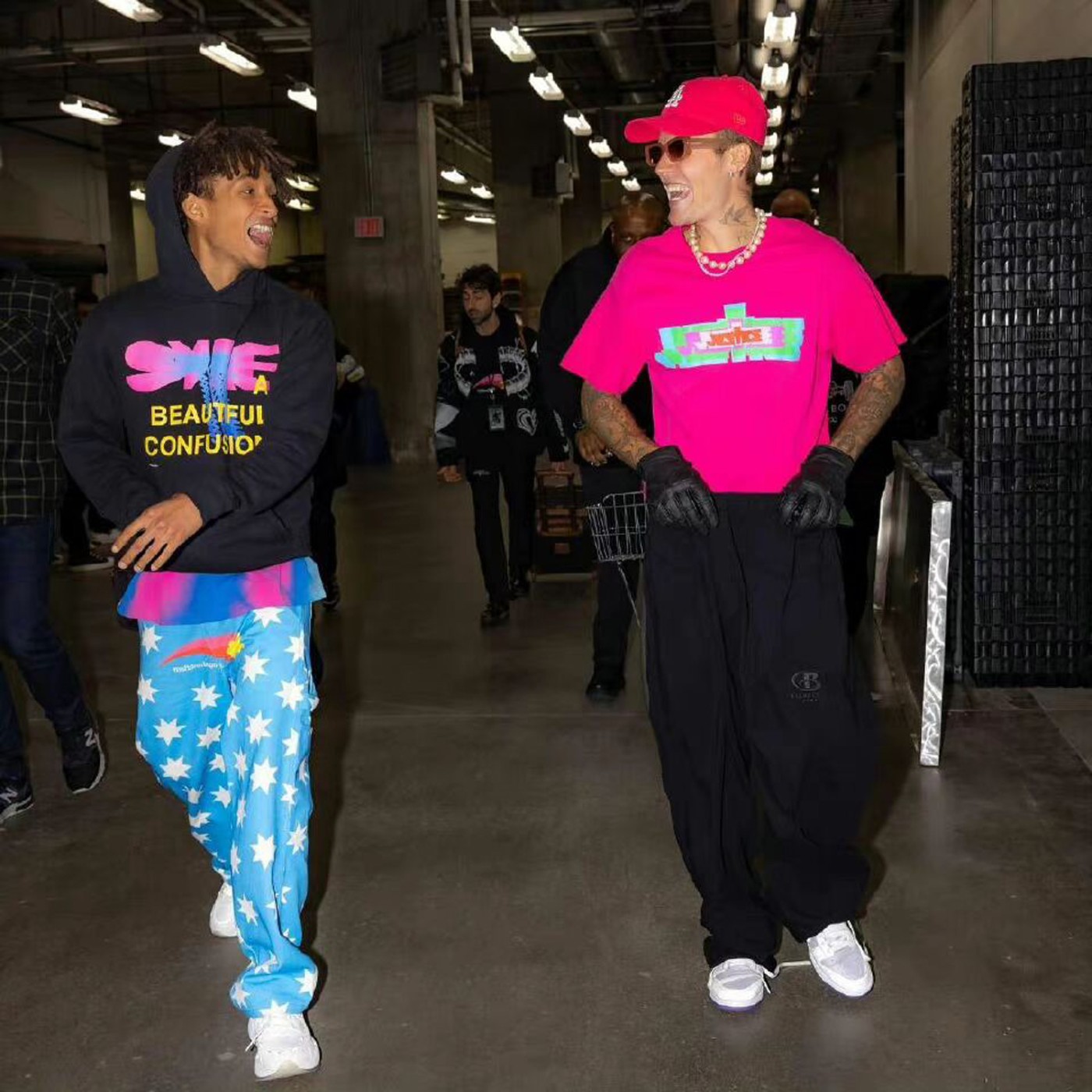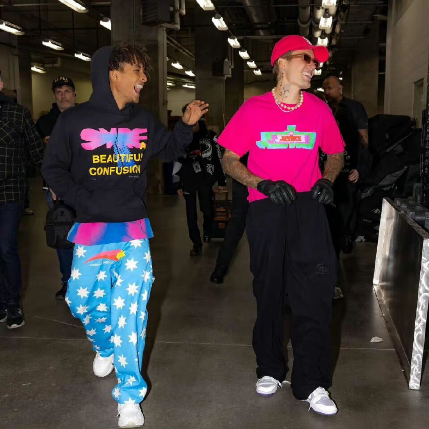 在后台他和贾登·史密斯的亲密合照也被发上社交媒体,比伯上脚一双 Union x Nike Dunk Low “Court Purple”。