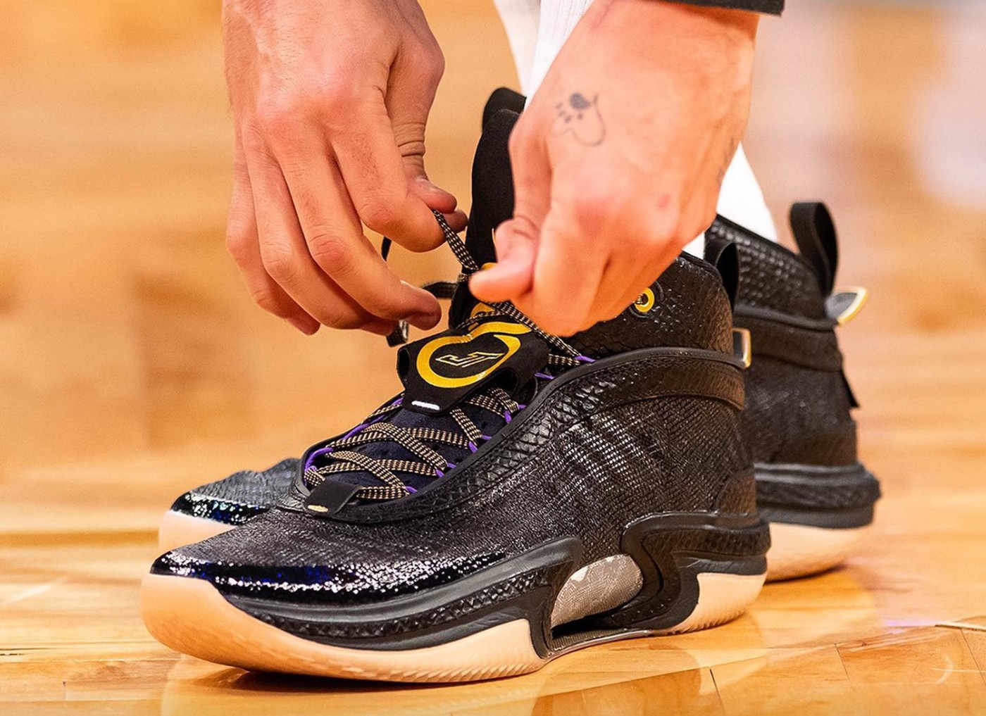 这双 Air Jordan 36 PE 的设计灵感就来自于科比,鞋舌上紫色和黄色的点缀也足以说明这一点。