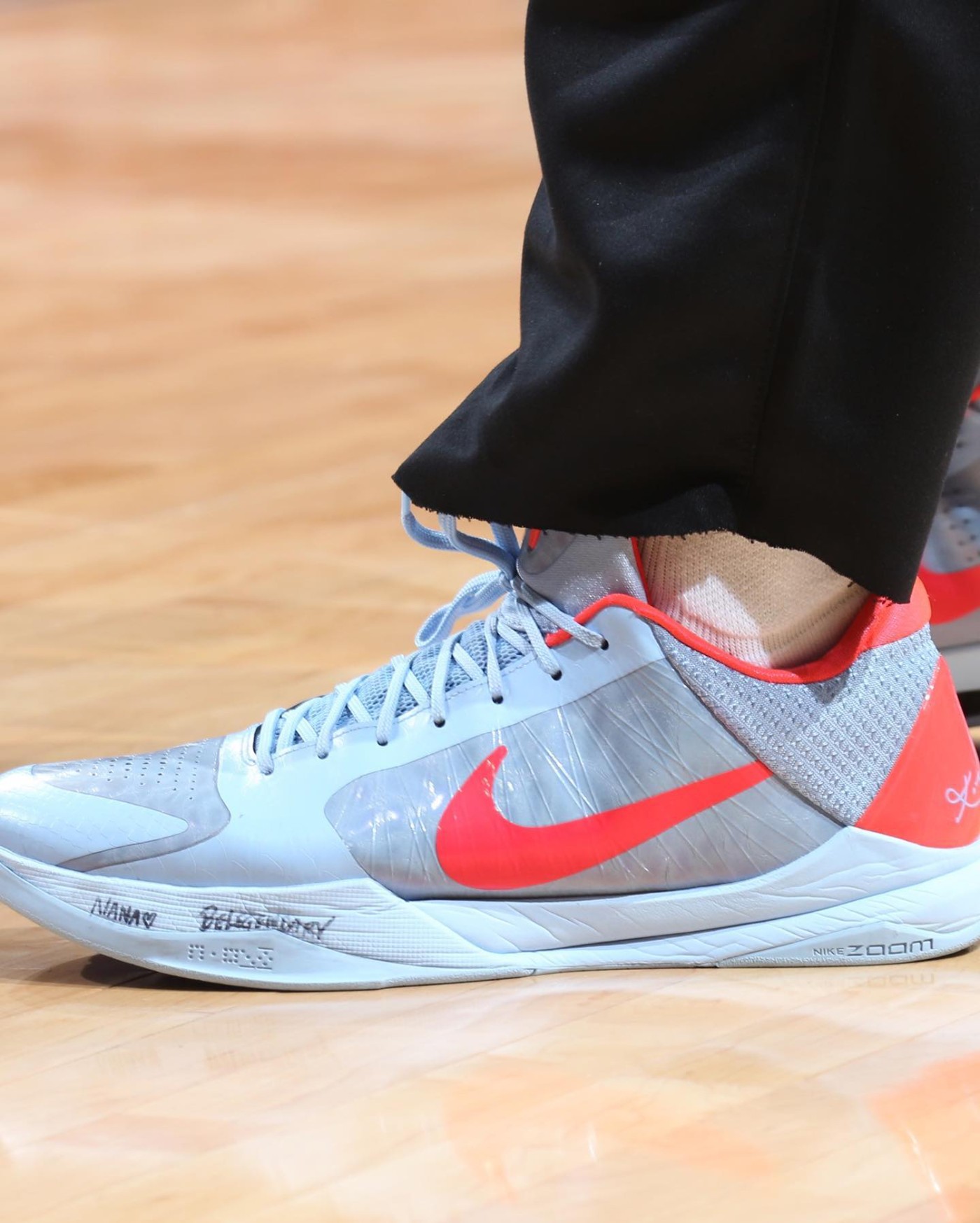 复出首战选择了 Nike Zoom Kobe 5,一如他的偶像科比扛着球队砥砺前行,球鞋上还写有自己女朋友「肯豆」的昵称 NANA 以及科比对他说的那句「Be Legendry」。