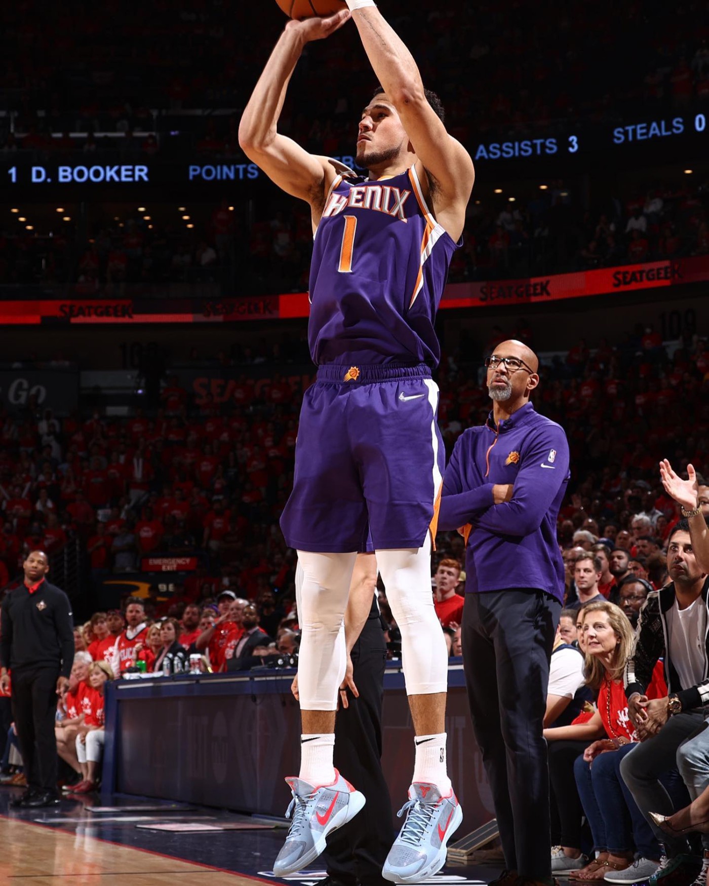 布克第六场火线归队,虽然能看的出来腿筋伤势对他的表现依旧有着影响,但是关键时刻毫不手软,关键三分球「杀人诛心」。