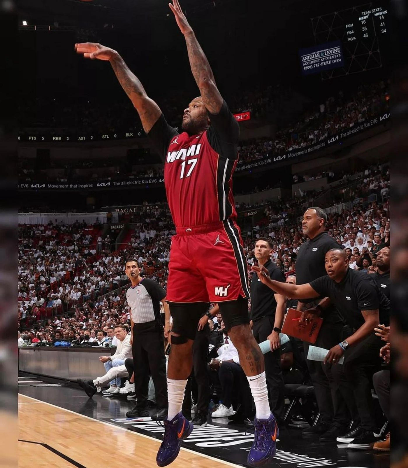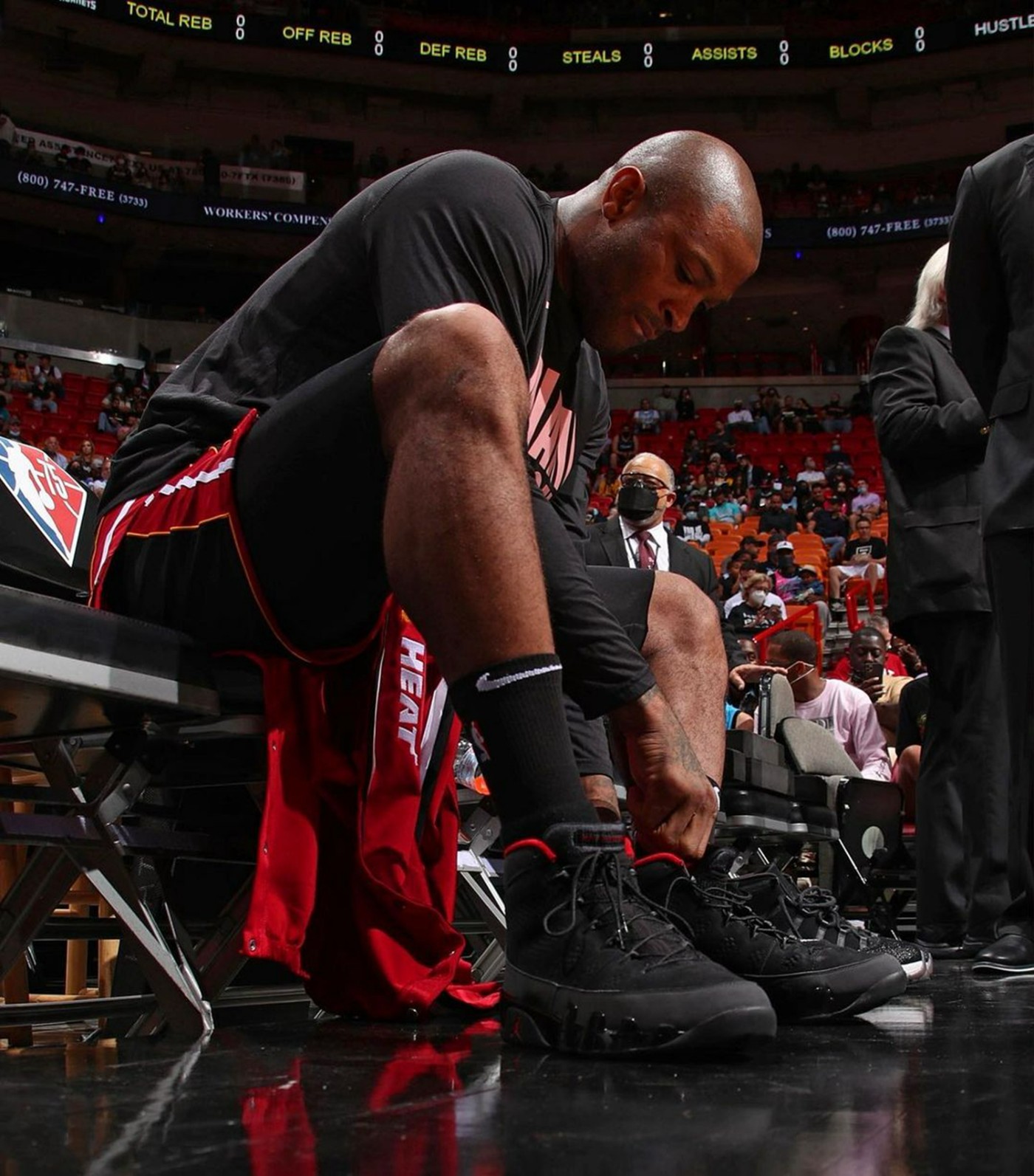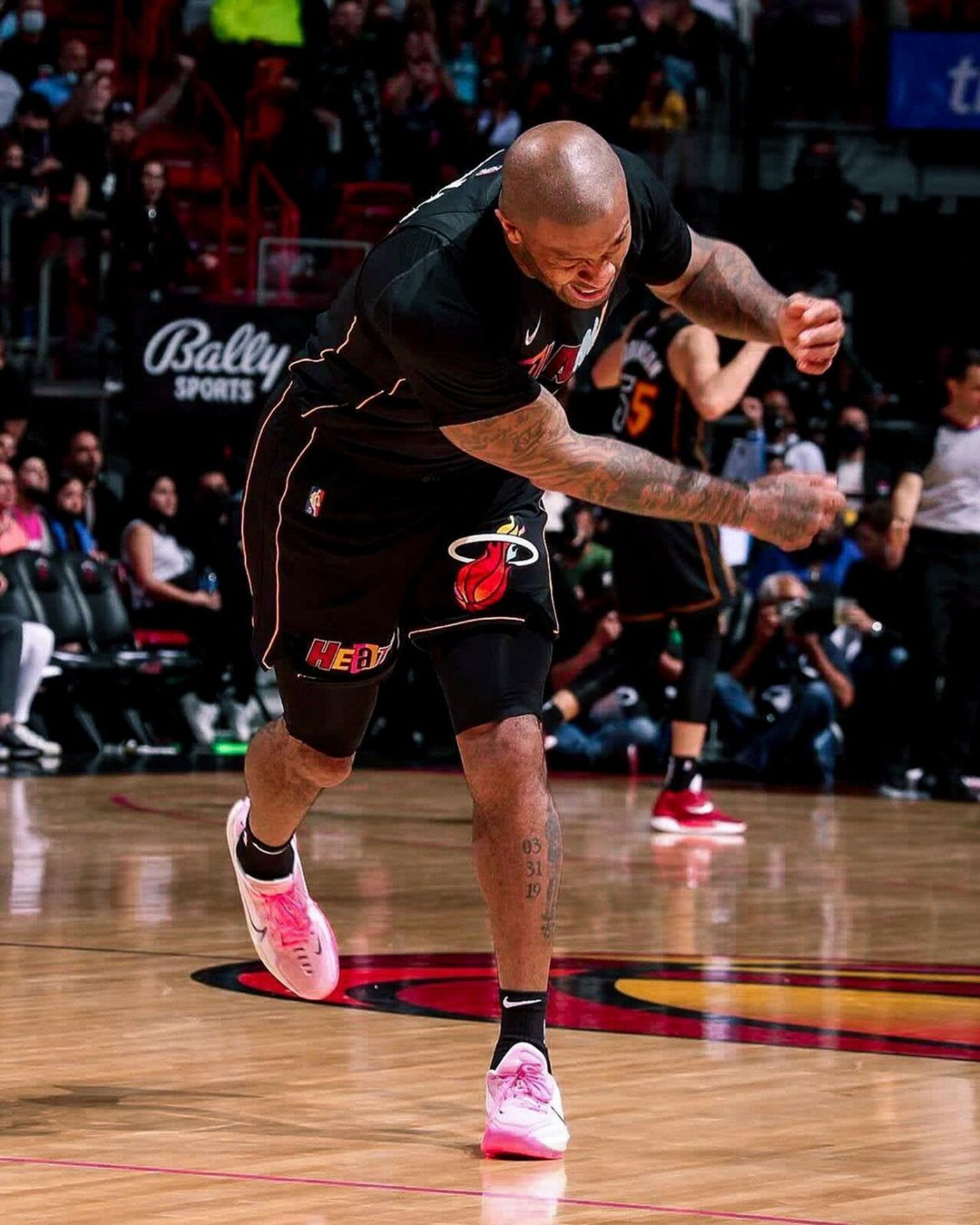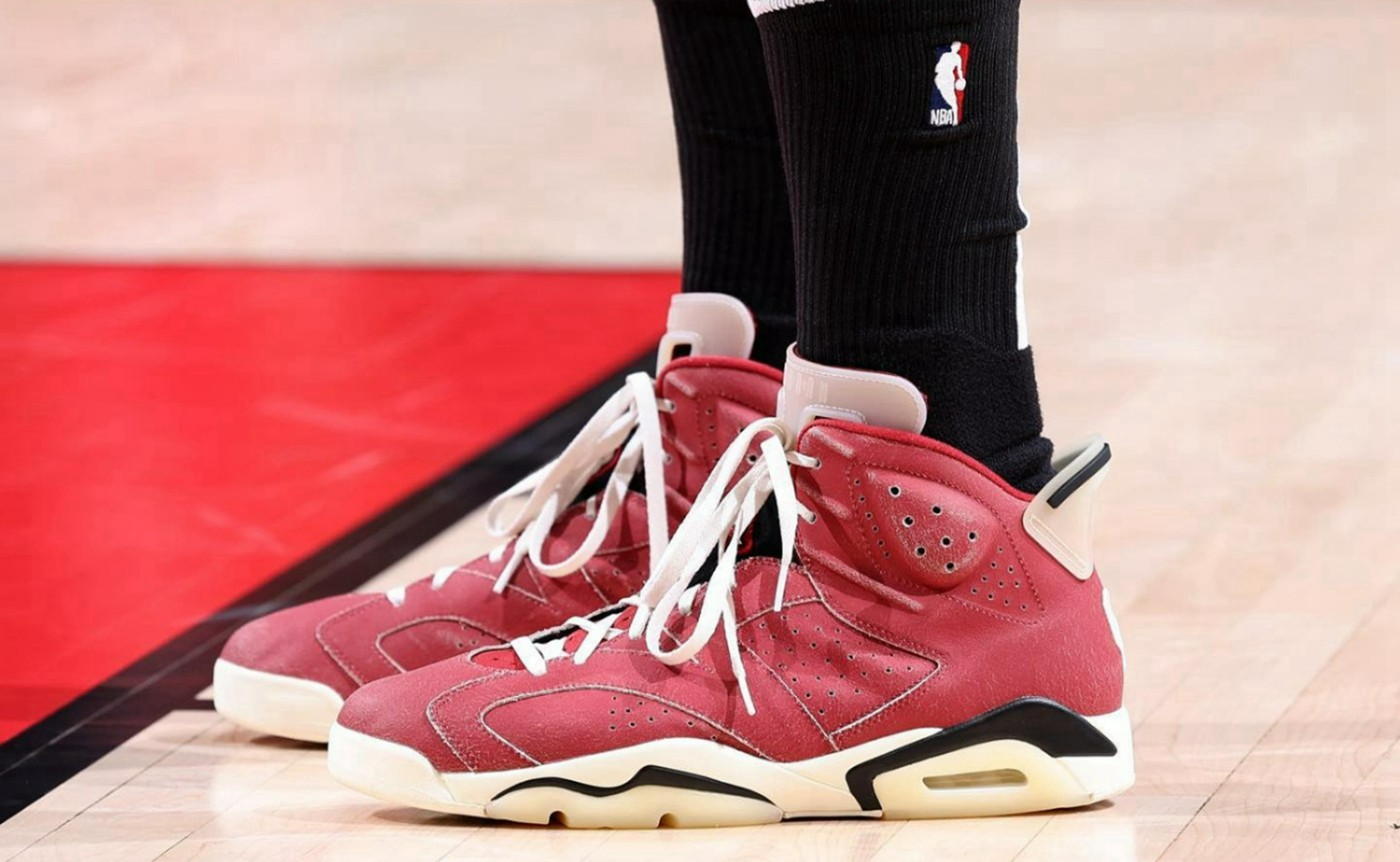 但有一说一,以 Air Jordan 9 的脚感,拿来打 NBA 属实有点 “废脚”,可能塔克往里面塞了自己定制的鞋垫吧!