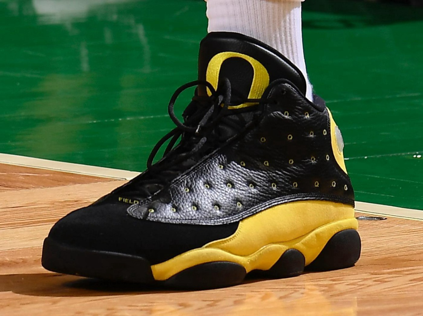 第一双就是双 “重磅炸弹”,市价 ¥13 万元的 Air Jordan 13 “俄勒冈” PE 就这样被塔克在高强度的比赛中穿着。