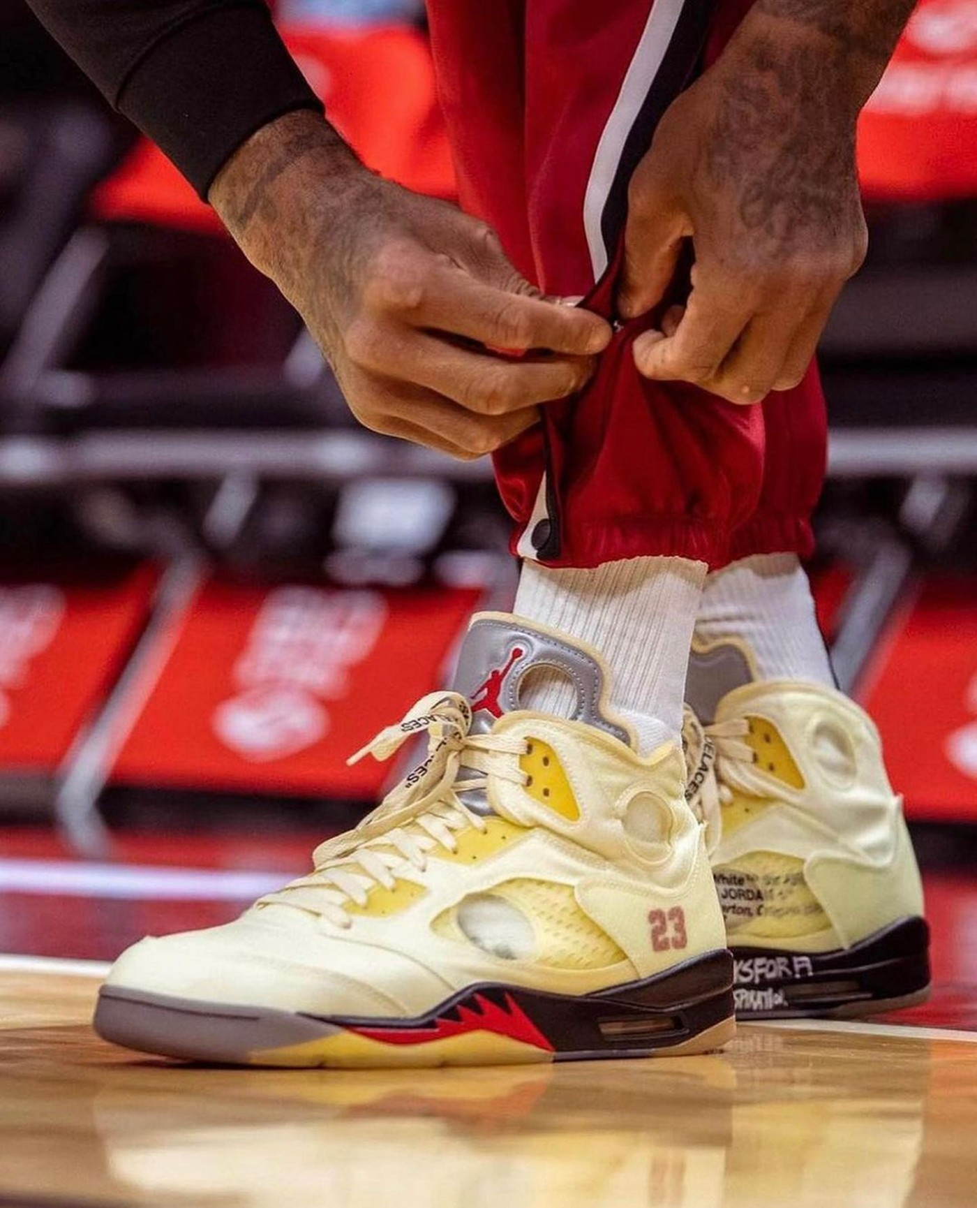 塔克作为 Virgil 的好友,在他离世后,上脚了一双写有纪念话语的 OFF-WHITE x Air Jordan 5 以作纪念。